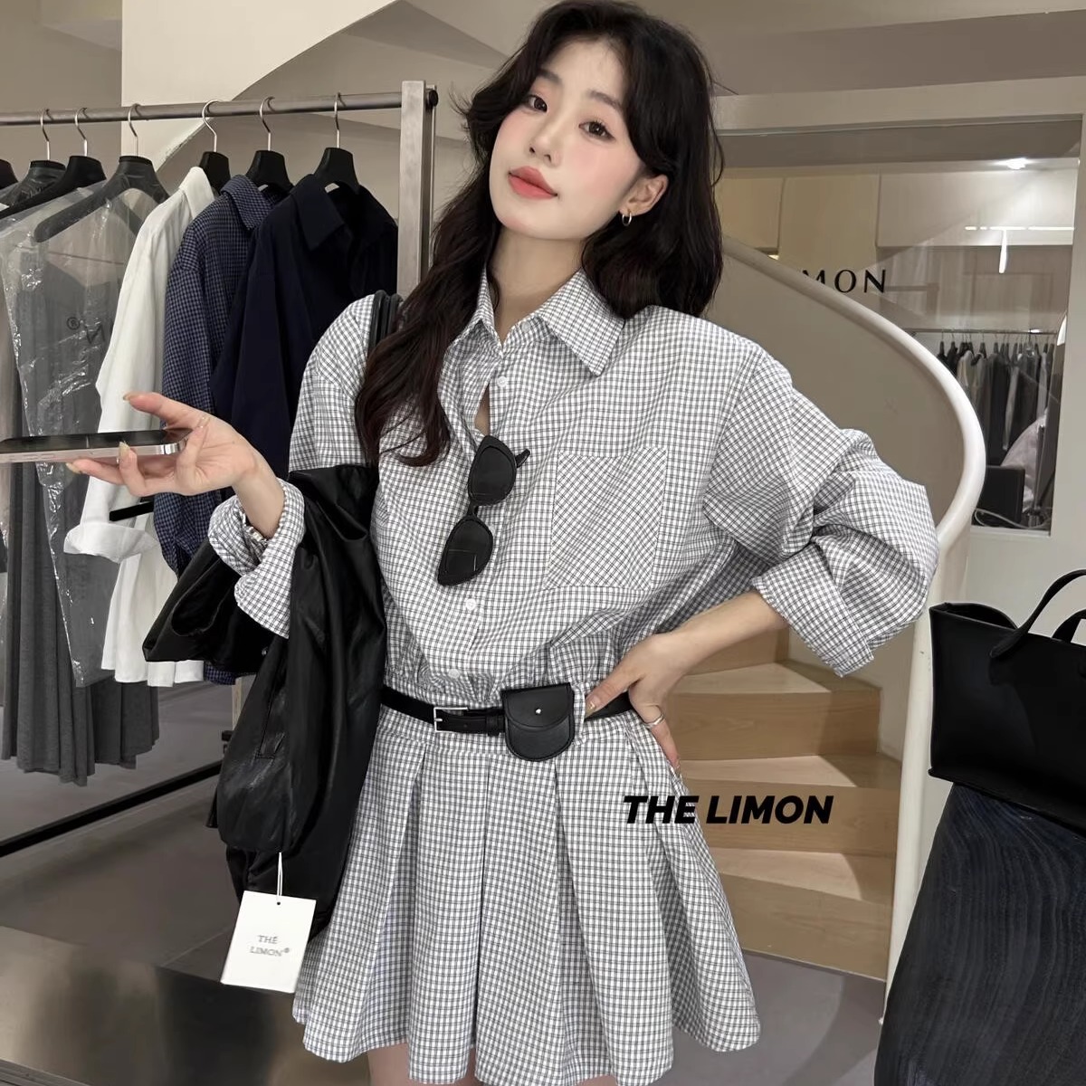 复古蓝色收腰格子长袖衬衫连衣裙女秋季辣妹显瘦高级感荷叶边短裙