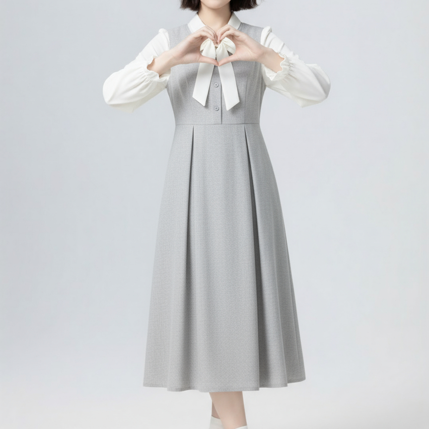法式蓝色假两件长袖连衣裙子女2025新款春秋季巨好看气质收腰长裙