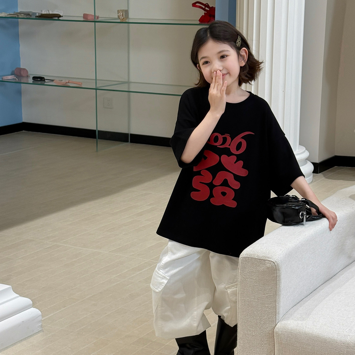 【亲子】柒号童仓女童韩版设计感发字短袖T恤春装新款慵懒上衣潮