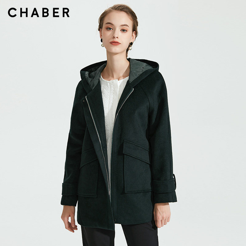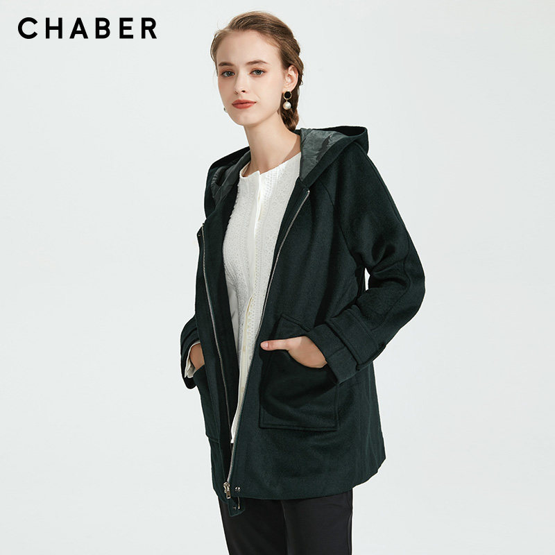 chaber巧帛商场同款冬季新品长袖连帽设计V领纯色毛呢大衣外套女