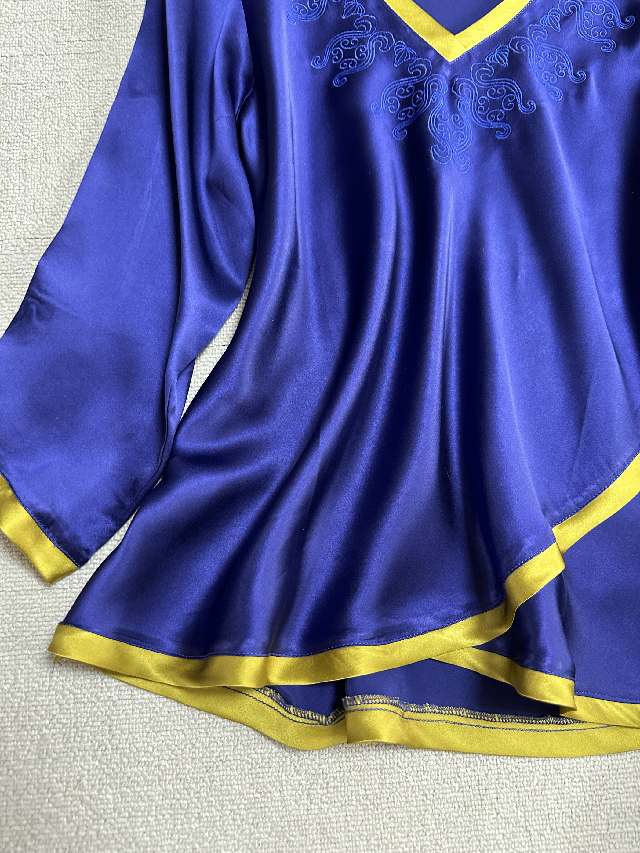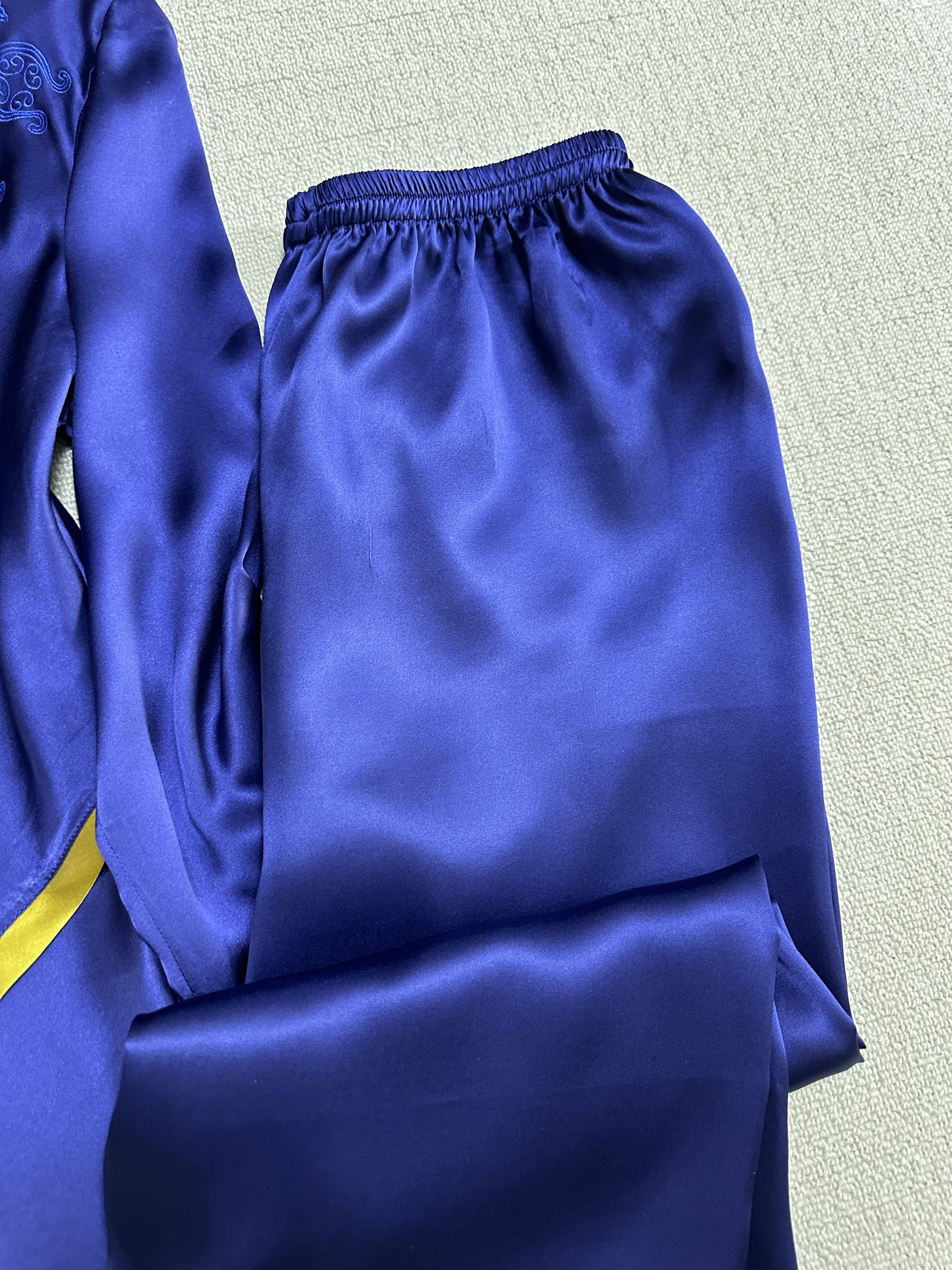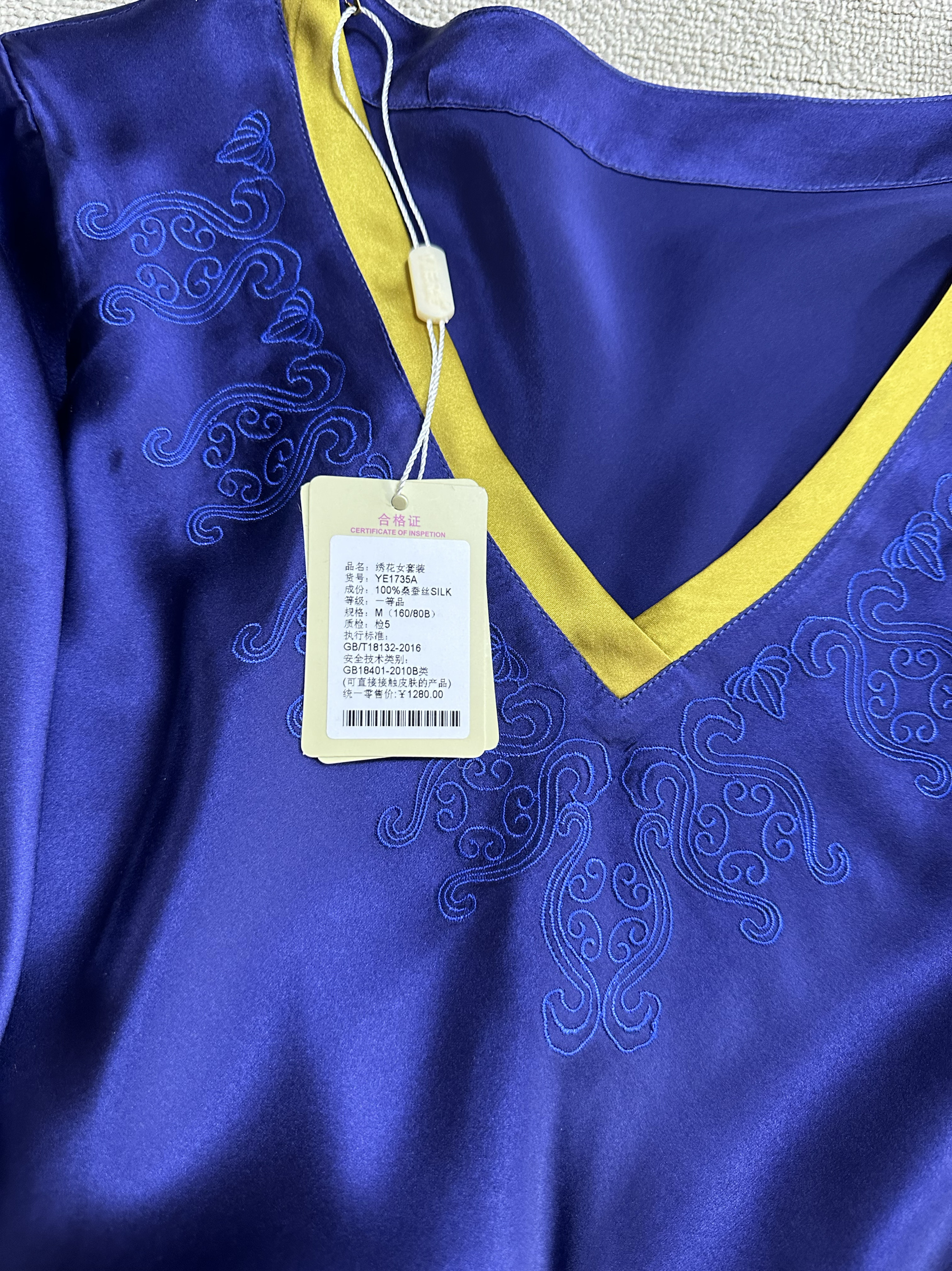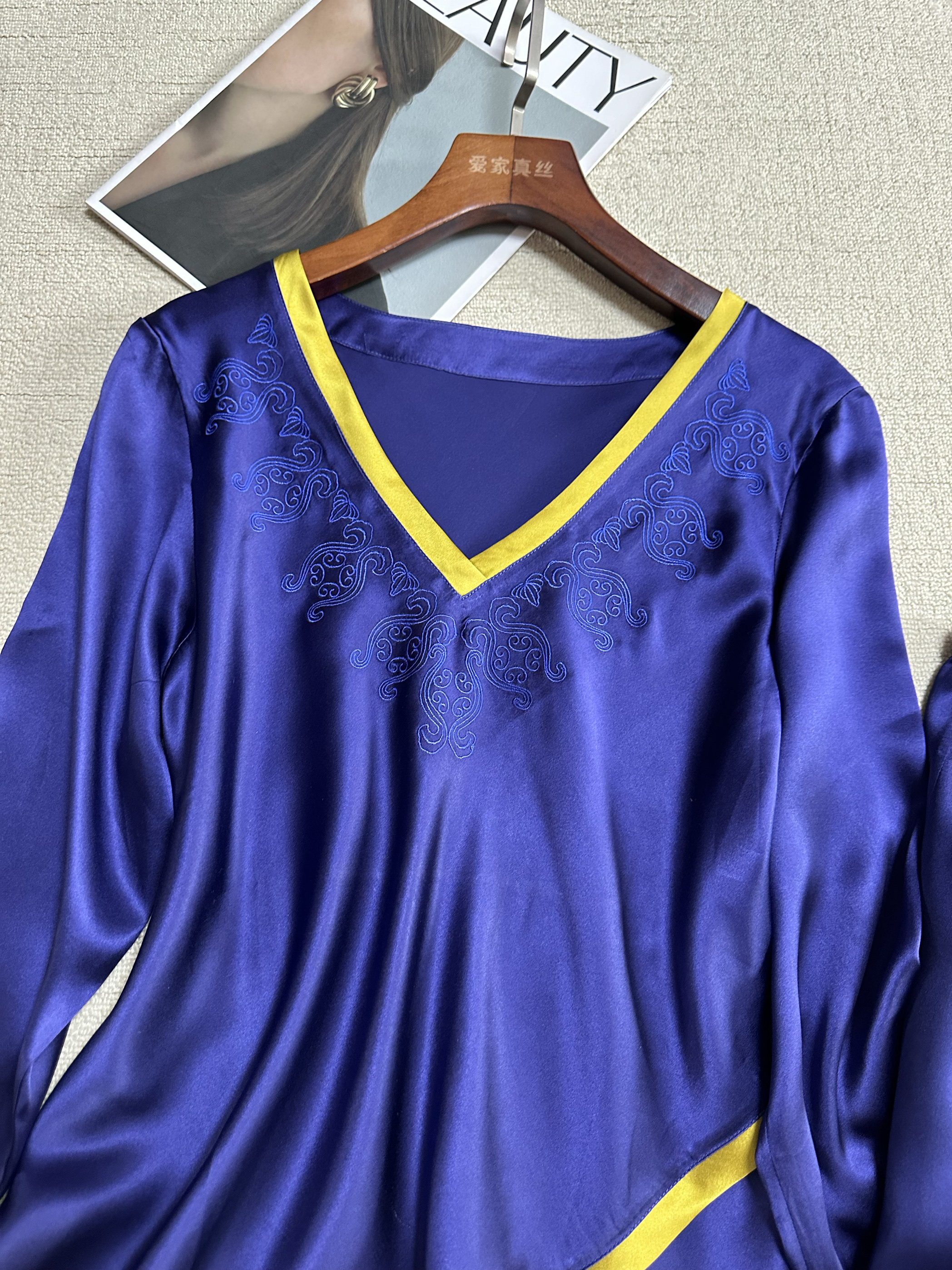 100%真丝素绉缎舒适纯色睡衣女 桑蚕丝V领绣花长袖长裤家居服套装
