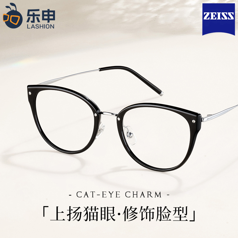 蔡司超轻纯钛猫眼近视眼镜框女黑框素颜方圆脸显瘦防蓝光可配度数