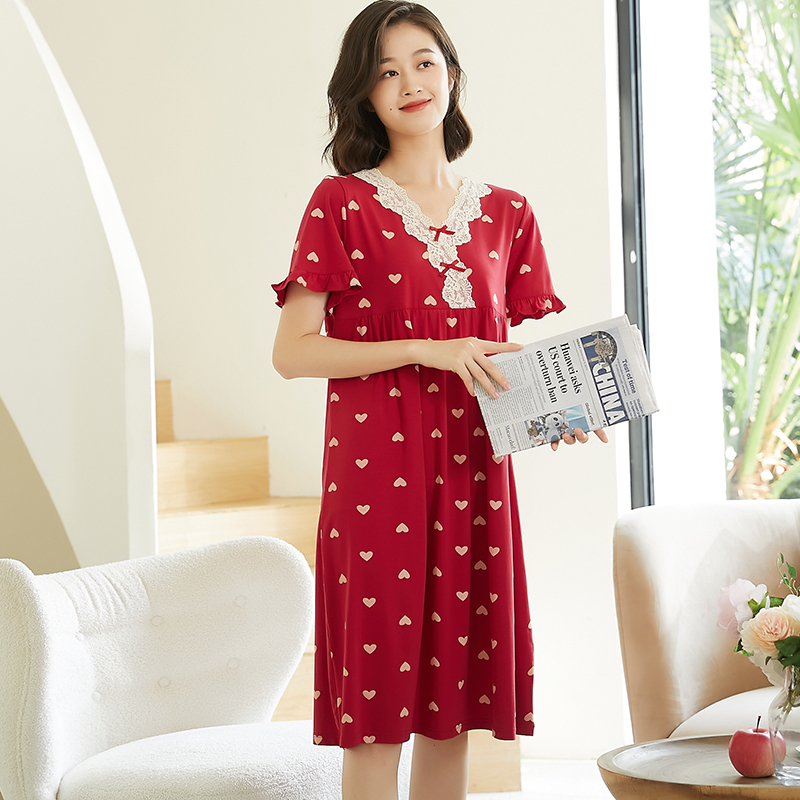 蓝豆娘夏季丝光棉睡裙短袖薄款宽松大码中裙子中年女士红色家居服