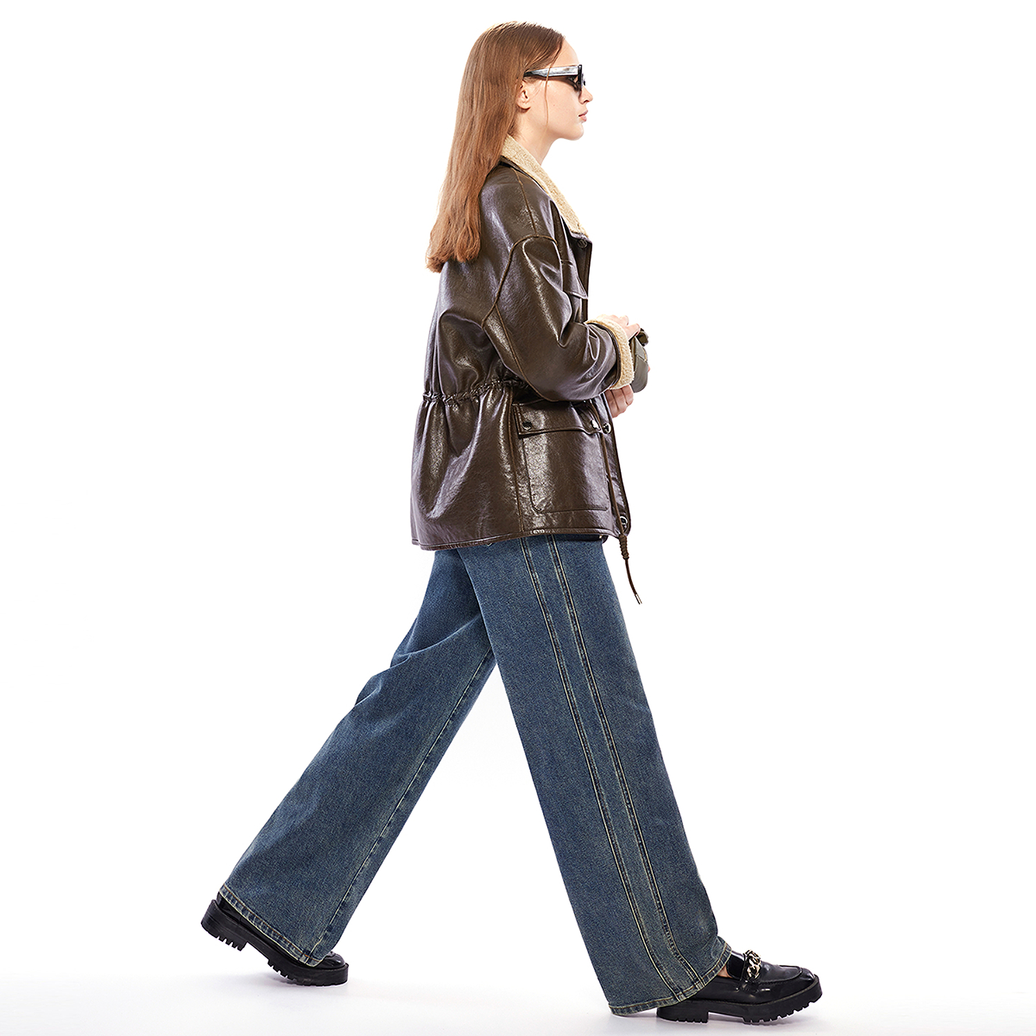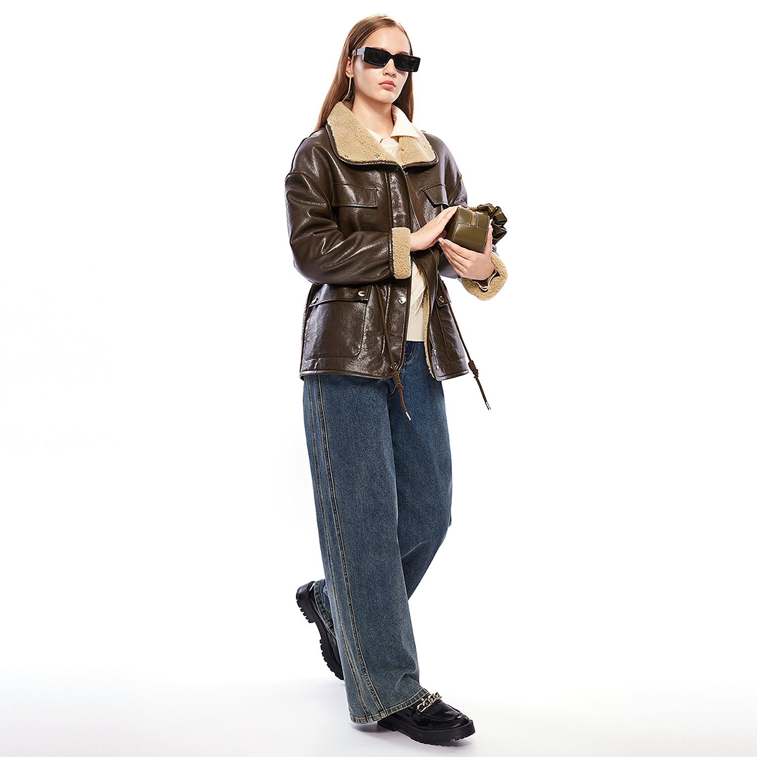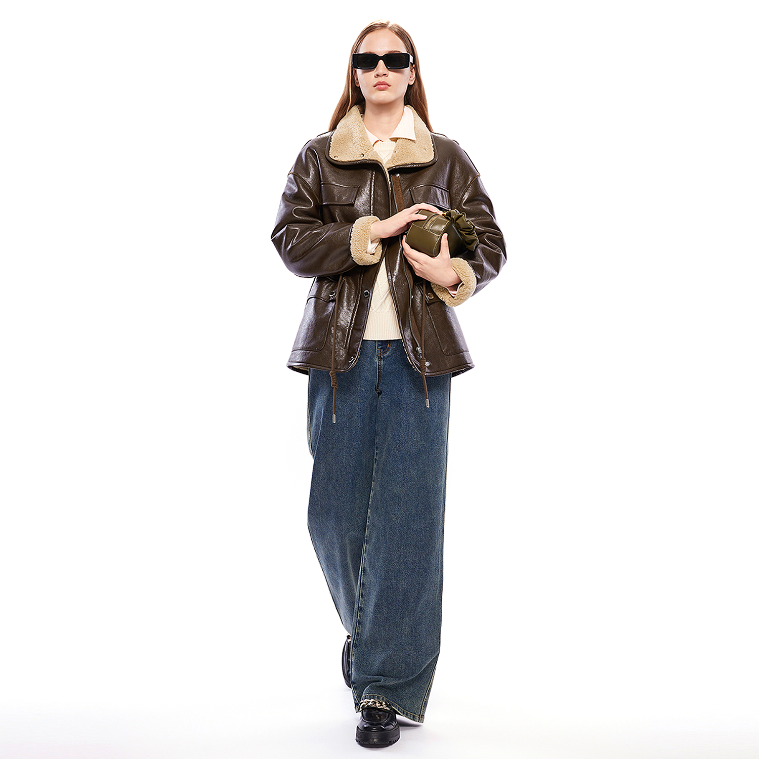 DKNY唐可娜儿25秋冬女装保暖复古仿羊羔绒皮毛一体收腰皮衣外套