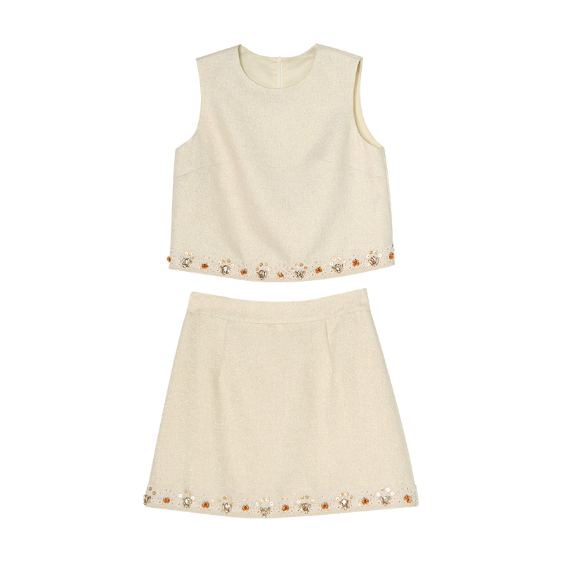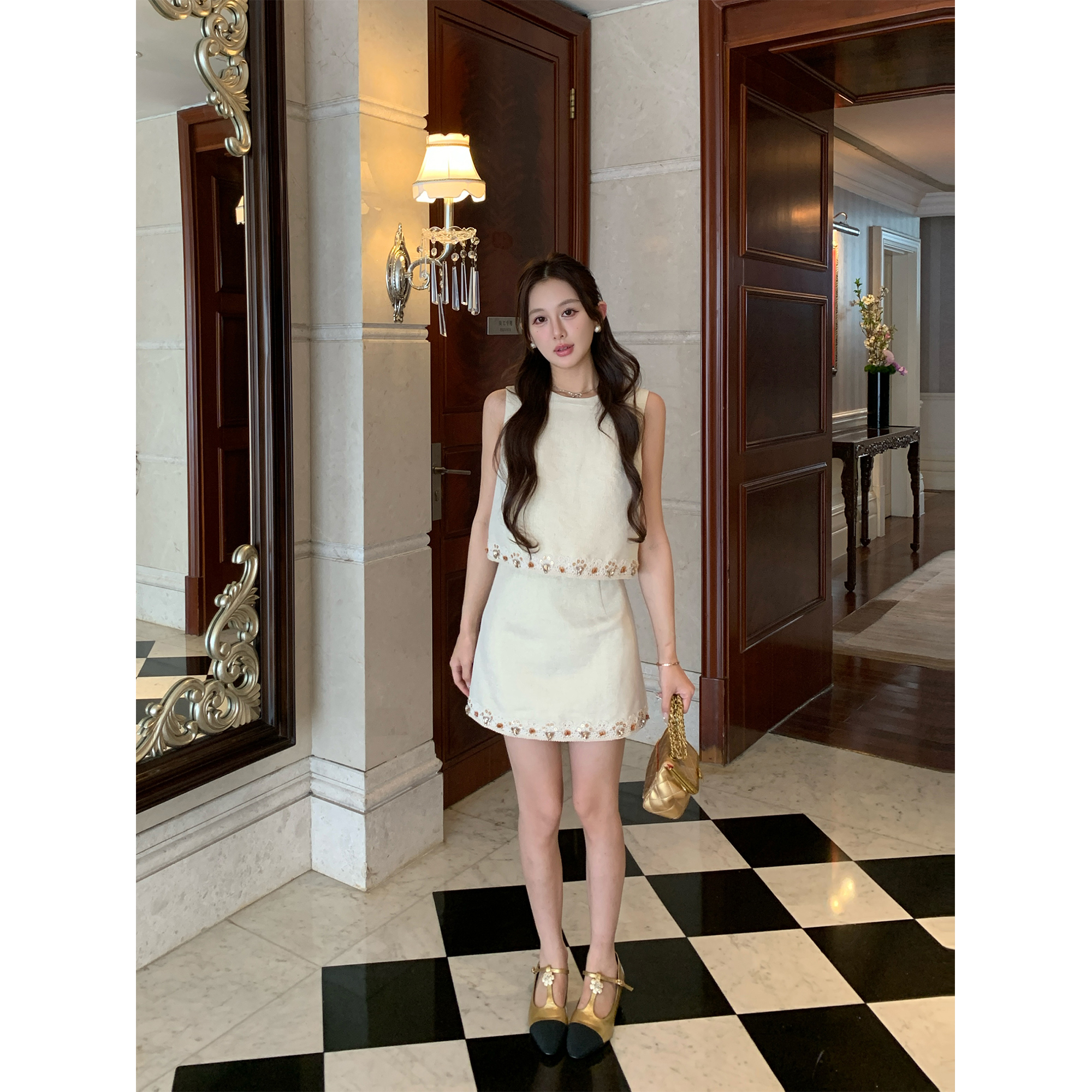 夏天家亚麻法式气质重工刺绣亮钻下摆马甲短款上衣+短裙子套装女
