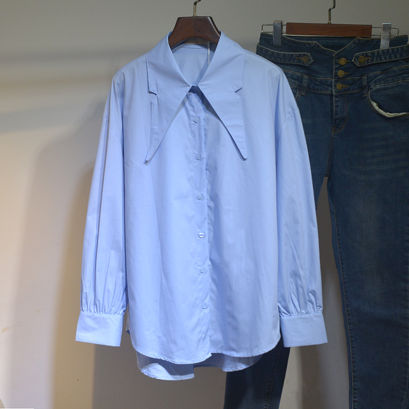 衬衫女春秋纯色大领子设计感韩版百搭宽松气质长袖打底尖领白衬衣