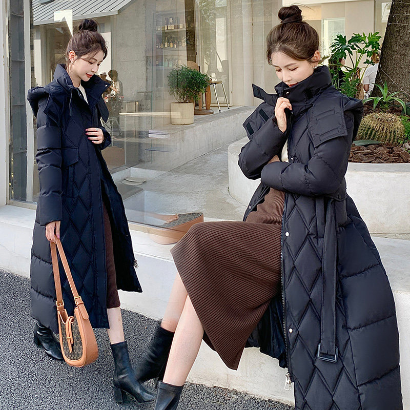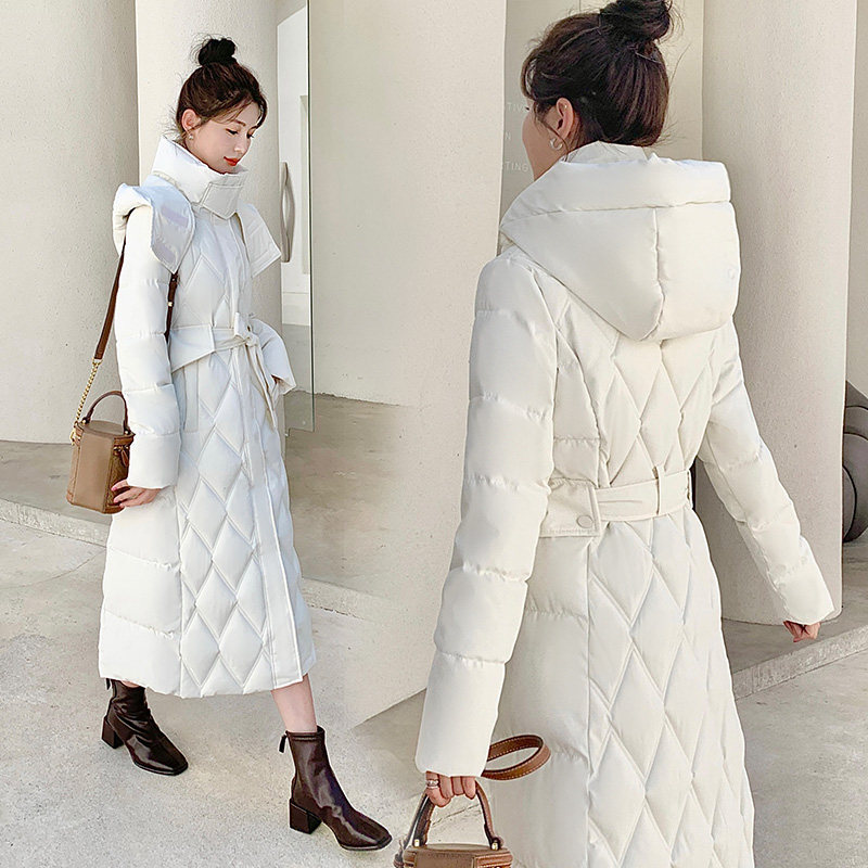 羽绒棉服女中长款2024新款连帽可脱卸冬季加厚修身腰带棉服外套潮