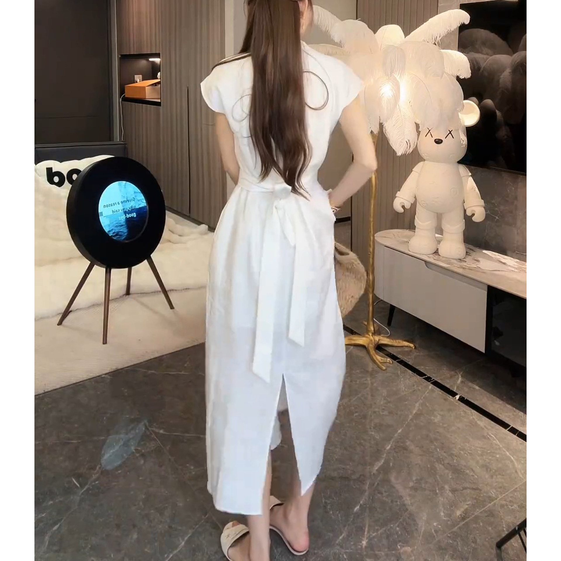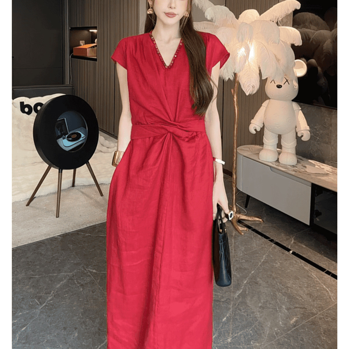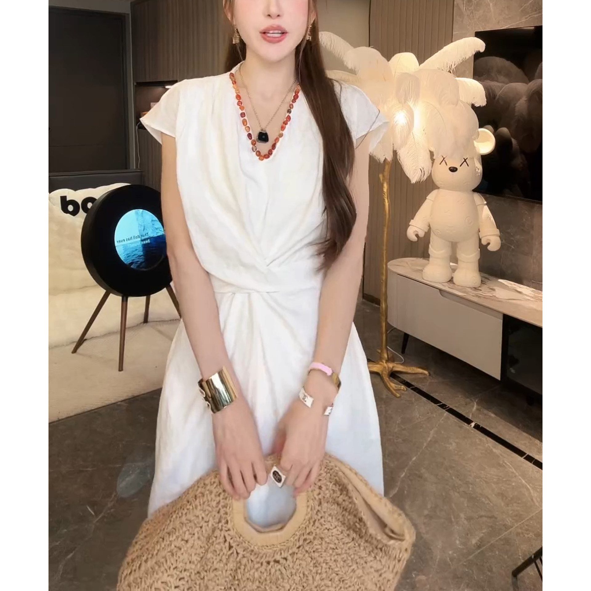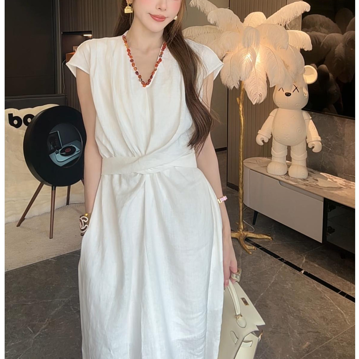 2025夏新款设计感收腰显瘦连衣裙时尚休闲宽松V领短袖中长款裙子