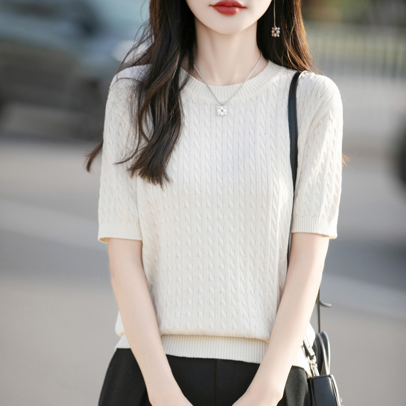 夏季新款100%纯棉针织短袖圆领T恤宽松显瘦麻花打底洋气上衣女