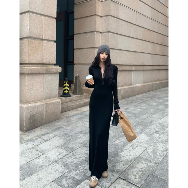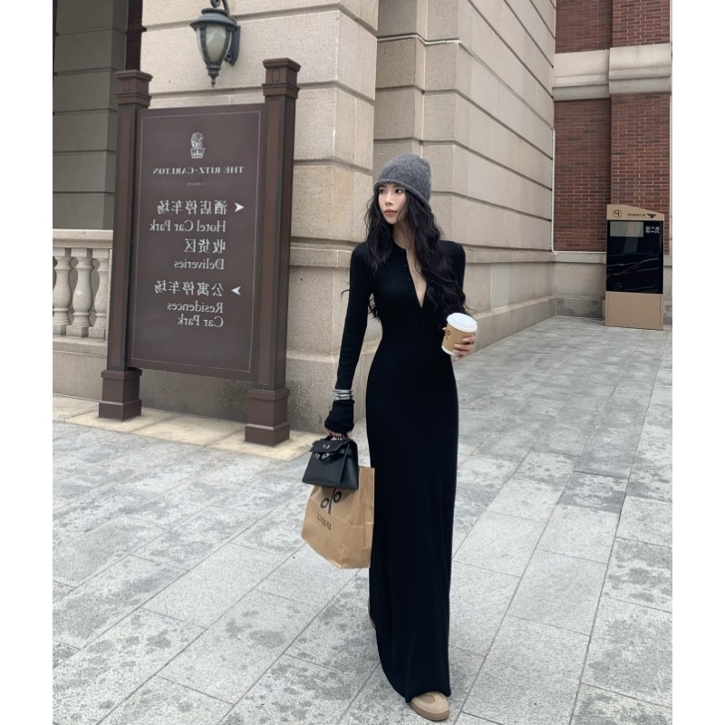 2025秋冬新款慵懒修身显瘦包臀长裙子打底裙针织长袖v领连衣裙女