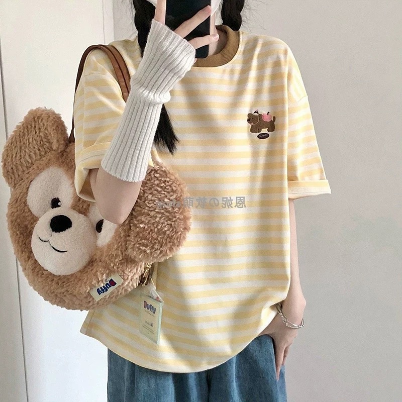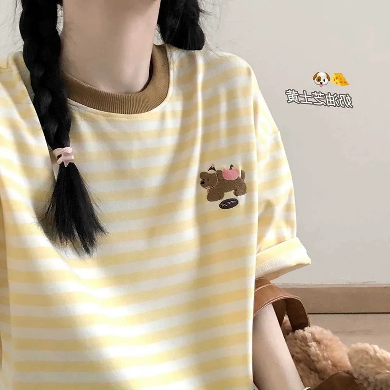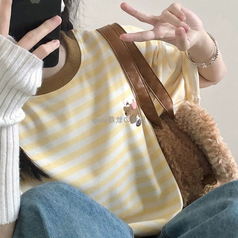 2025夏季设计感短袖卡通宽松休闲条纹短袖t恤女圆领刺绣上衣