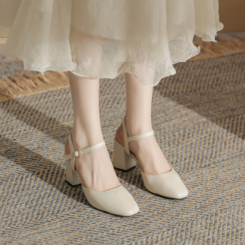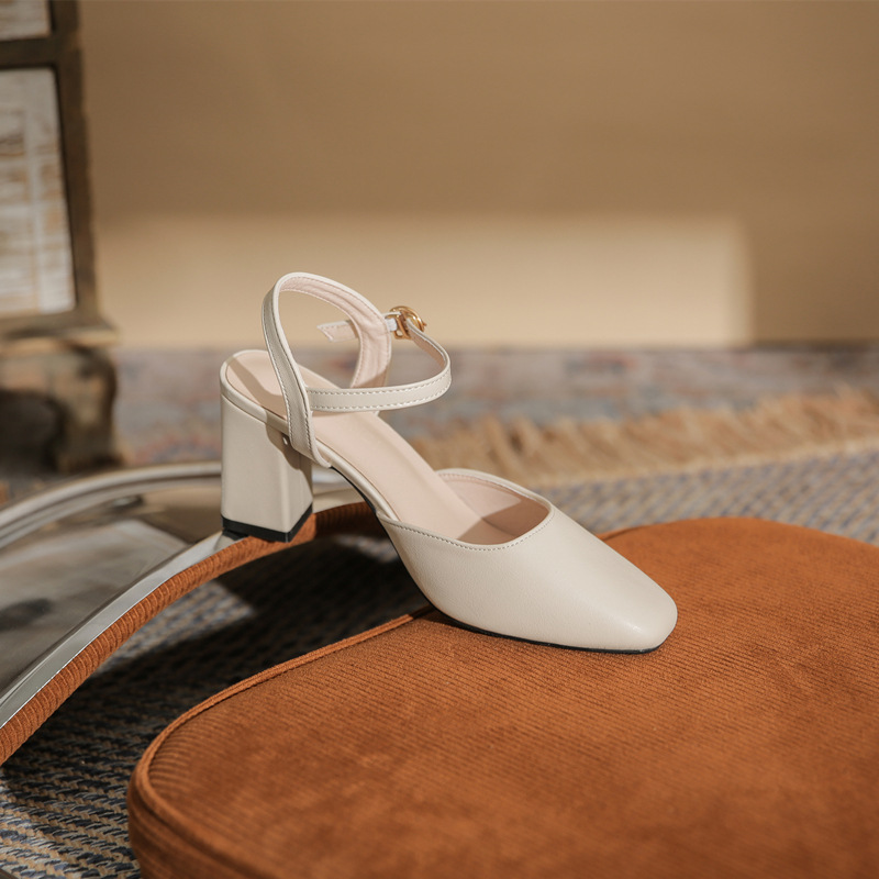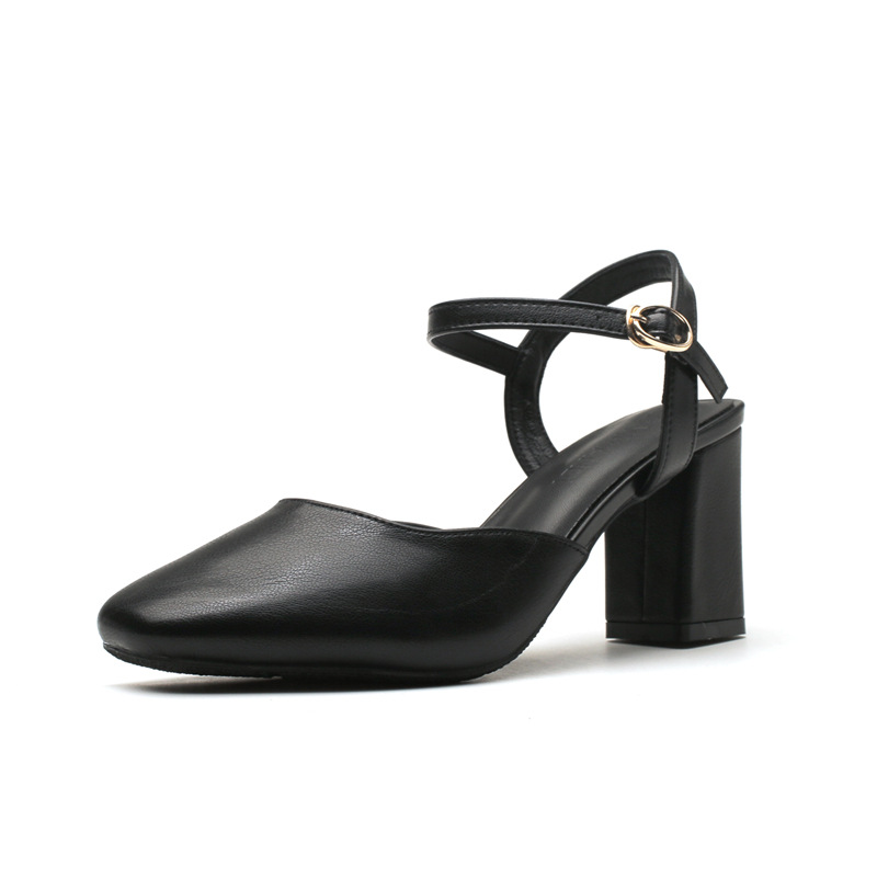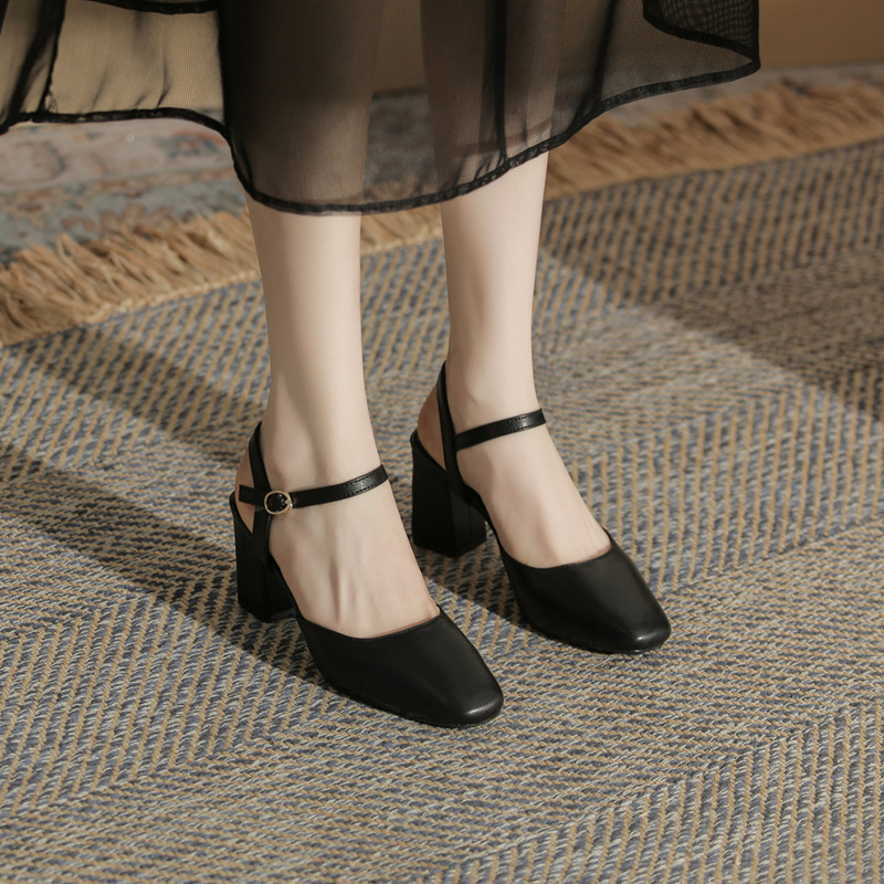 2024新款方头粗跟高跟鞋大码加肥加宽一字扣凉鞋包头后空百搭