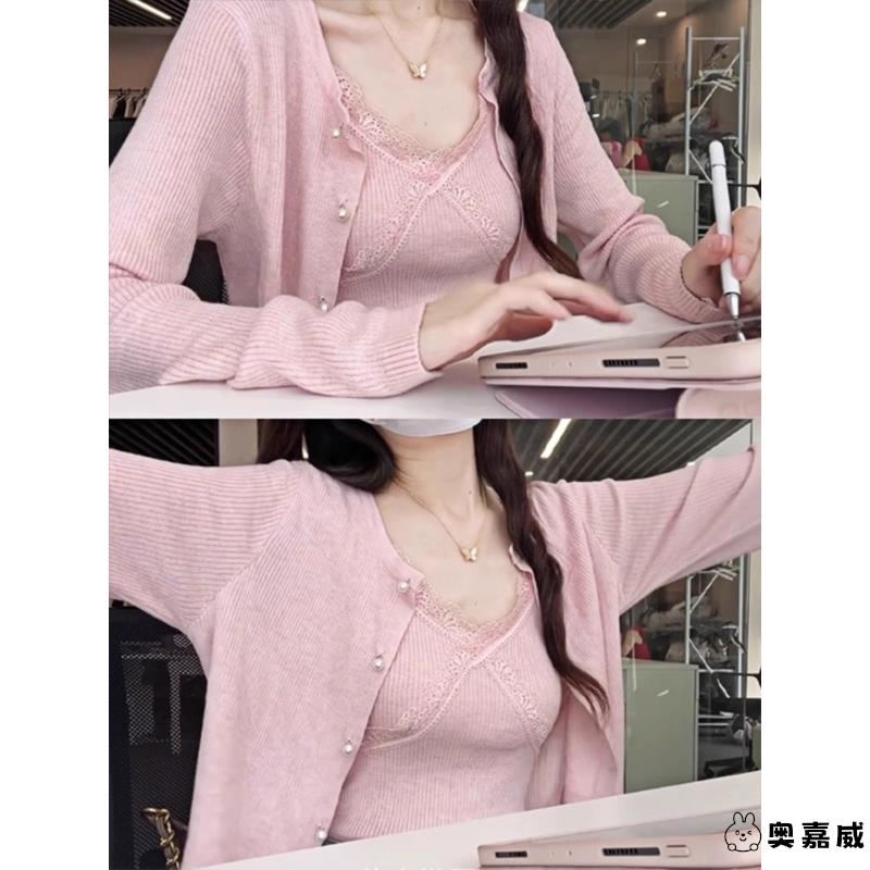 粉色修身长袖薄款针织外搭开衫女春季小个子独特绝美短款外套上衣