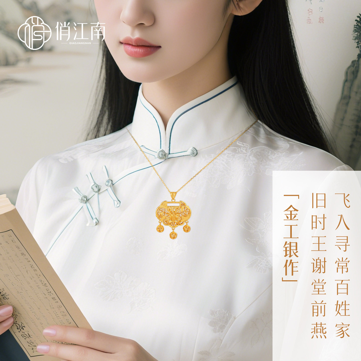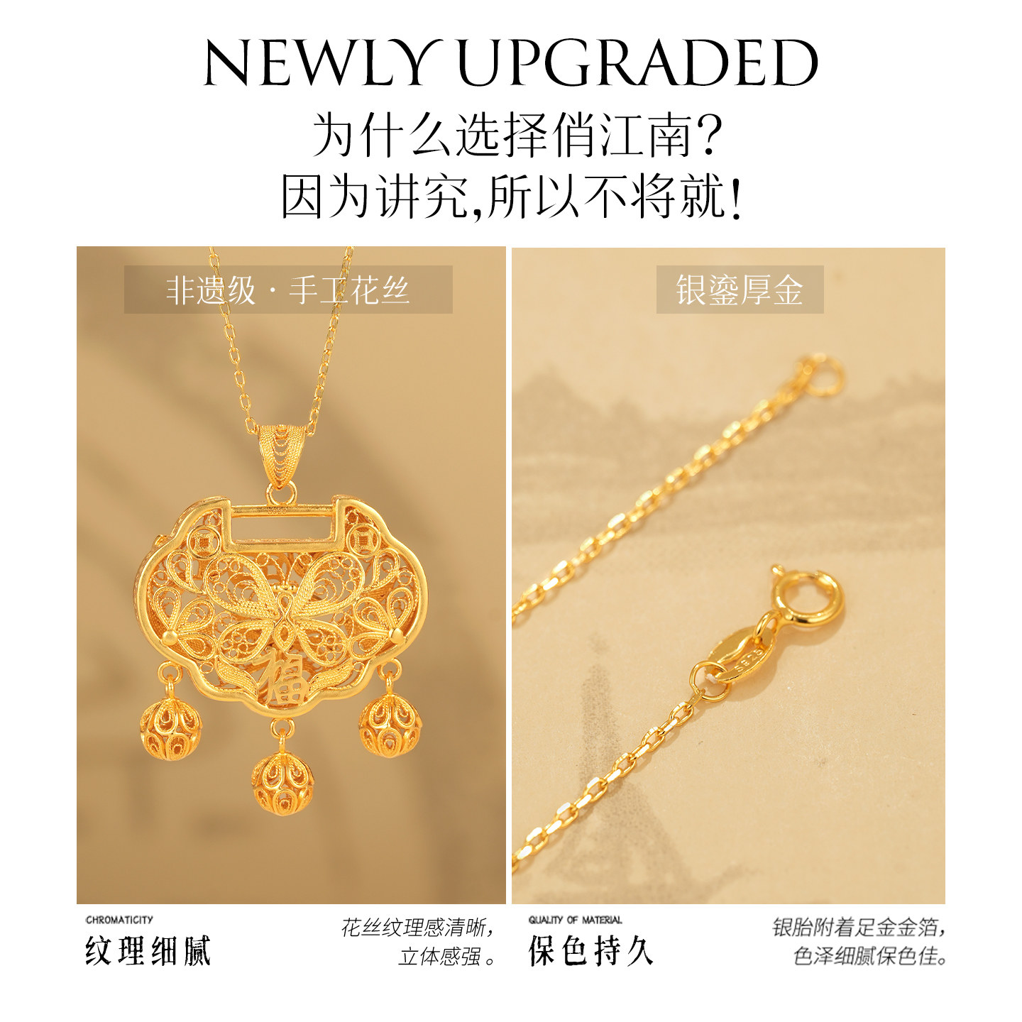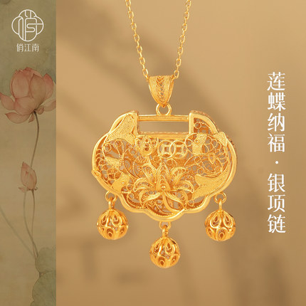 蝴蝶锦鲤银鎏金平安锁非遗花丝镂空新中式纯银吊坠项链宝宝长命锁