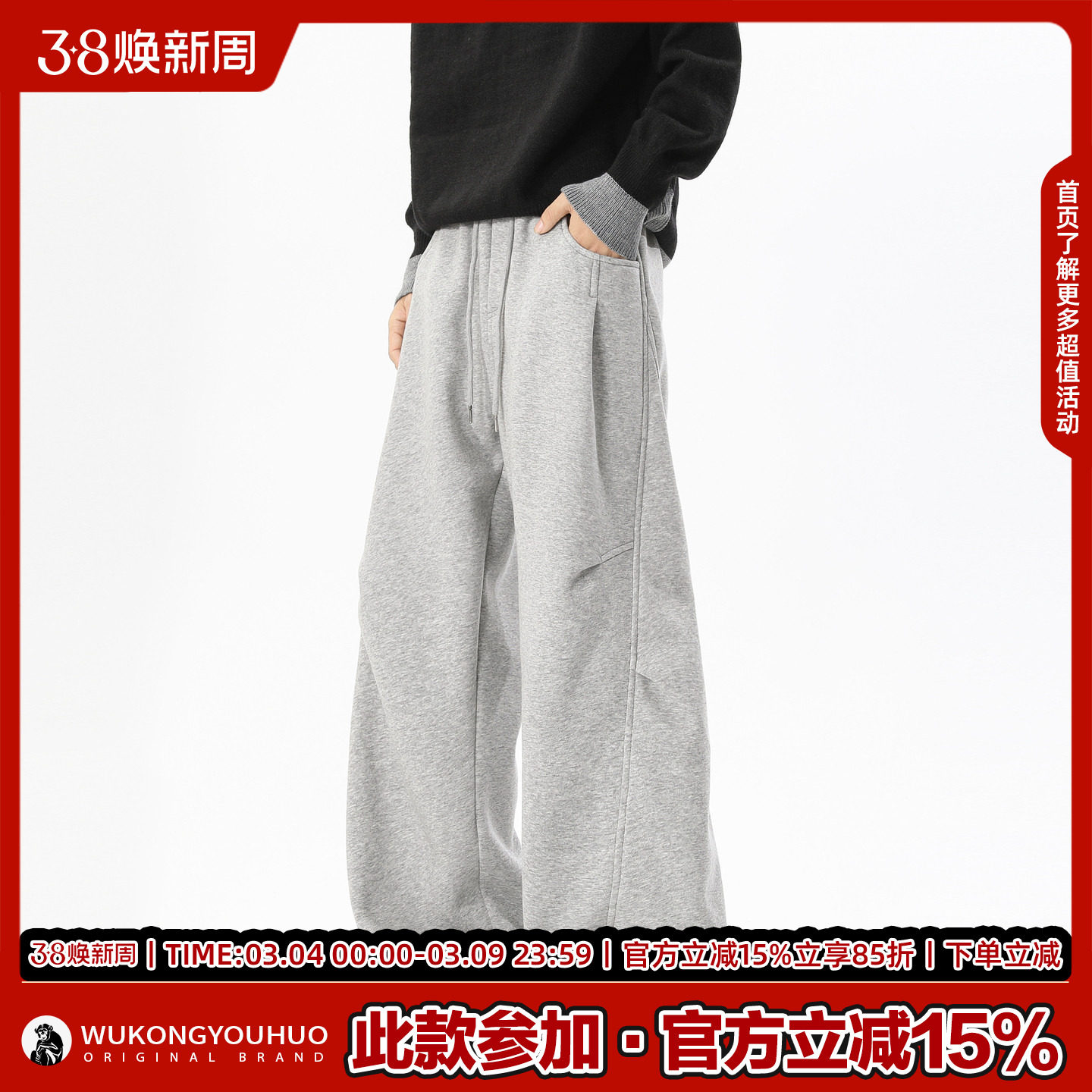 悟空有货潮牌美式褶皱水洗运动卫裤男女街头复古宽松潮流百搭长裤
