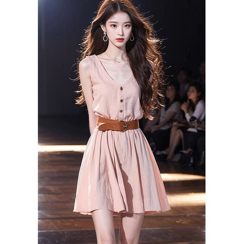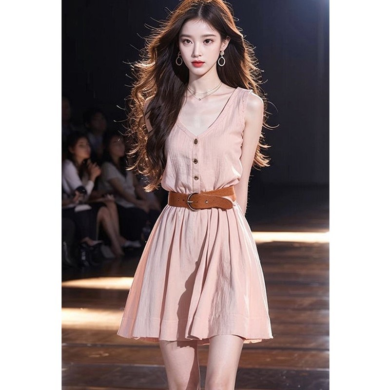 法式茶歇小个子V领背心裙子夏季新款设计感收腰显瘦无袖连衣裙女