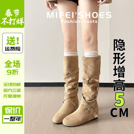 米霏~内增高中高筒堆堆靴女胖mm粗腿显瘦长筒西部牛仔靴大码长靴
