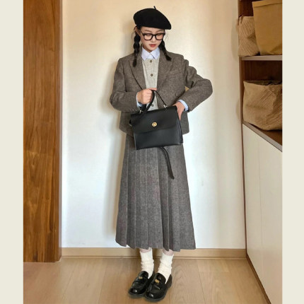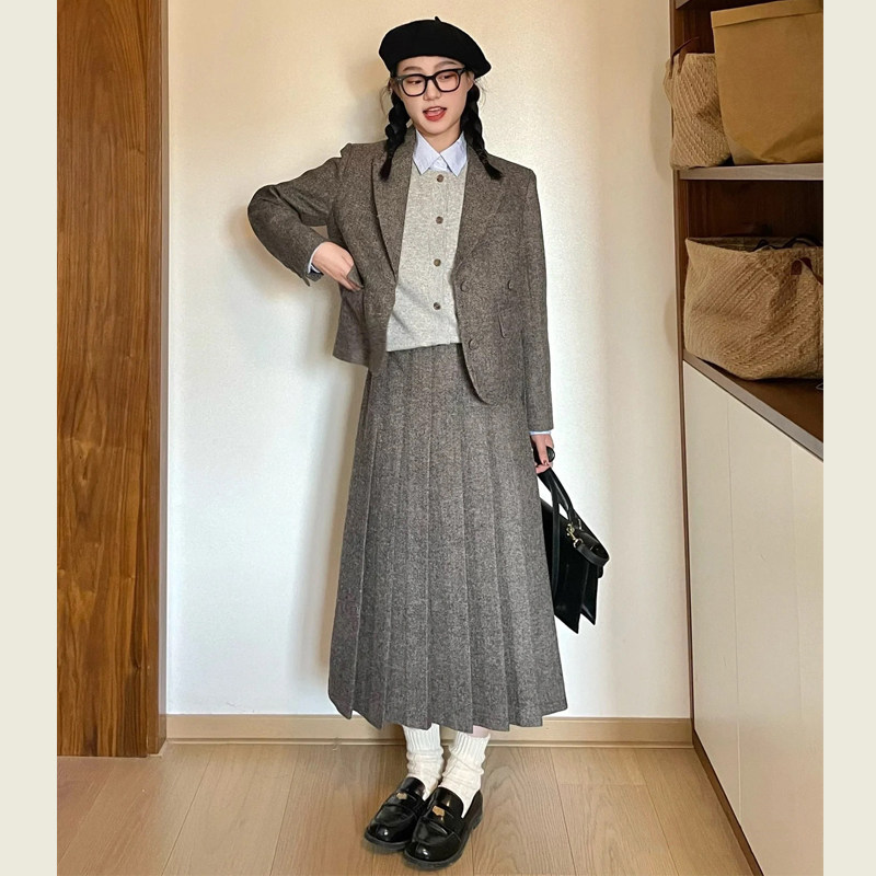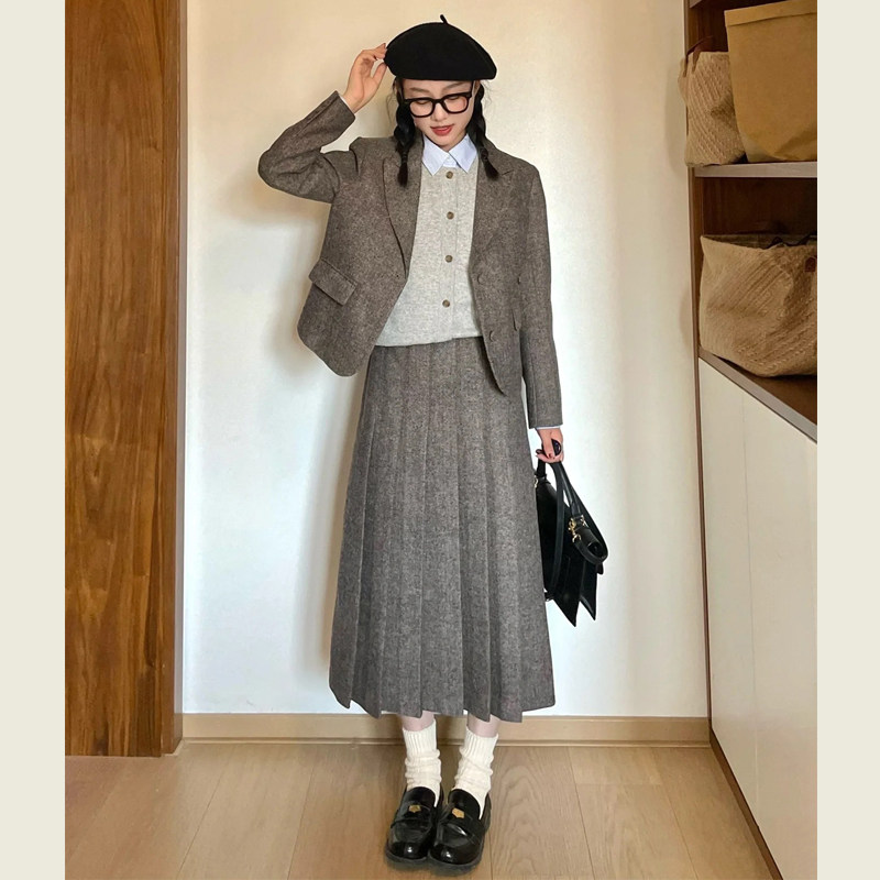 韩版毛呢西装套装女秋冬季小个子复古灰色呢子西服半身长裙两件套