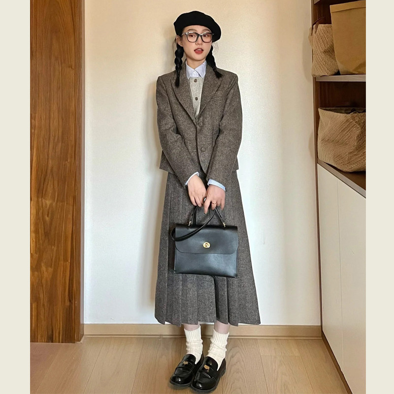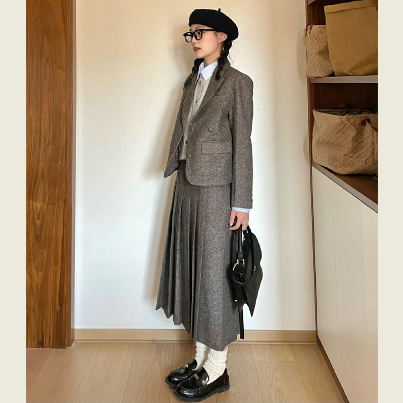 韩版复古灰色毛呢西装套装