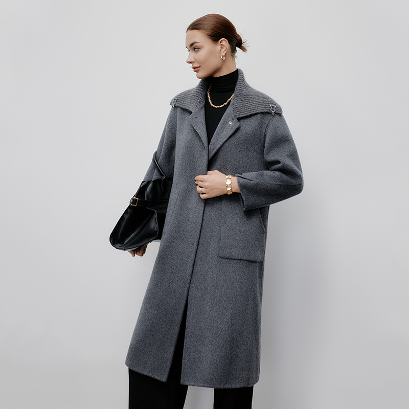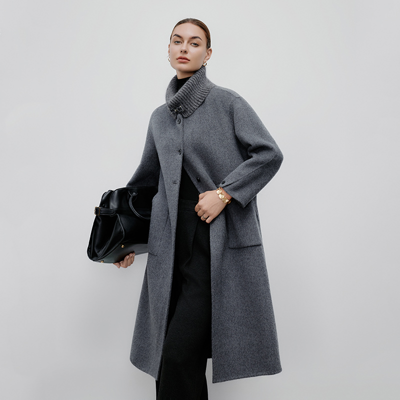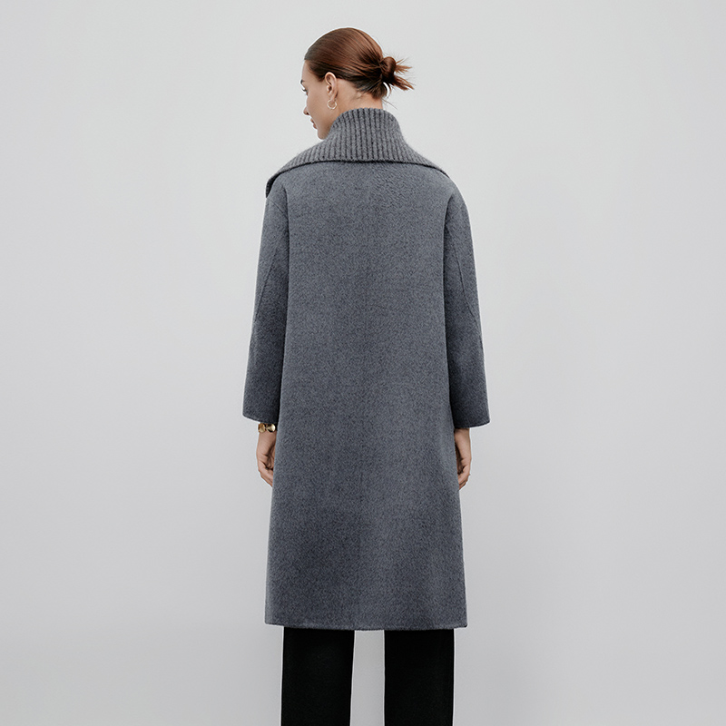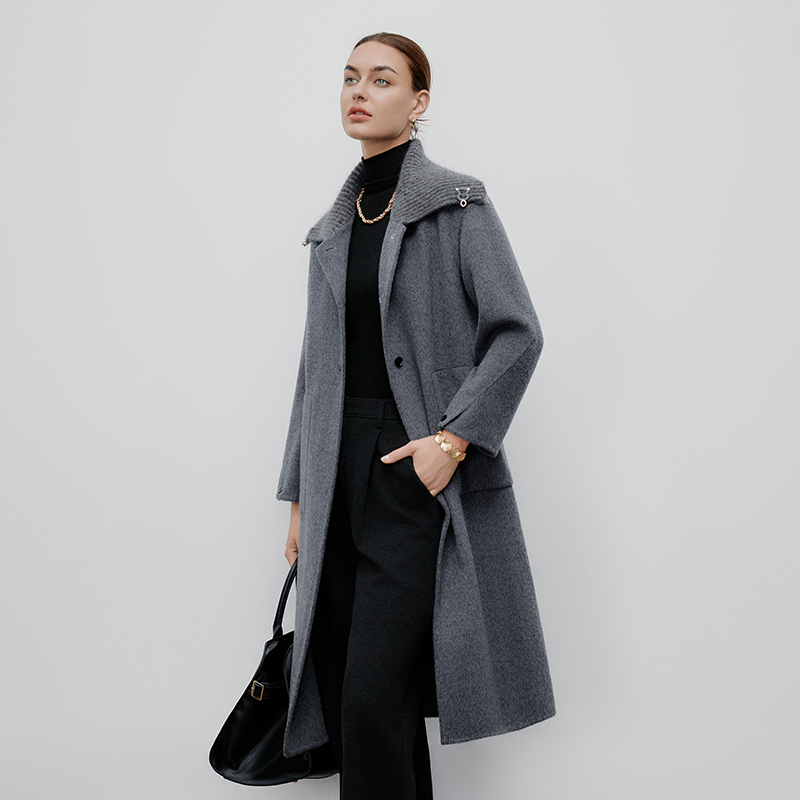 针织翻领大衣女款2025新款双面绵羊毛100%气质直筒中长款毛呢外套