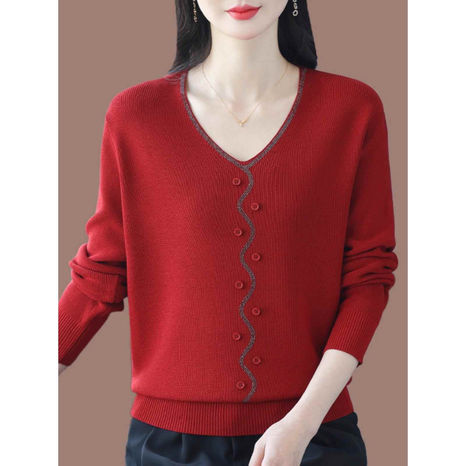 高贵洋气妈妈装V领长袖针织打底衫春秋宽松减龄中老年女冰丝上衣