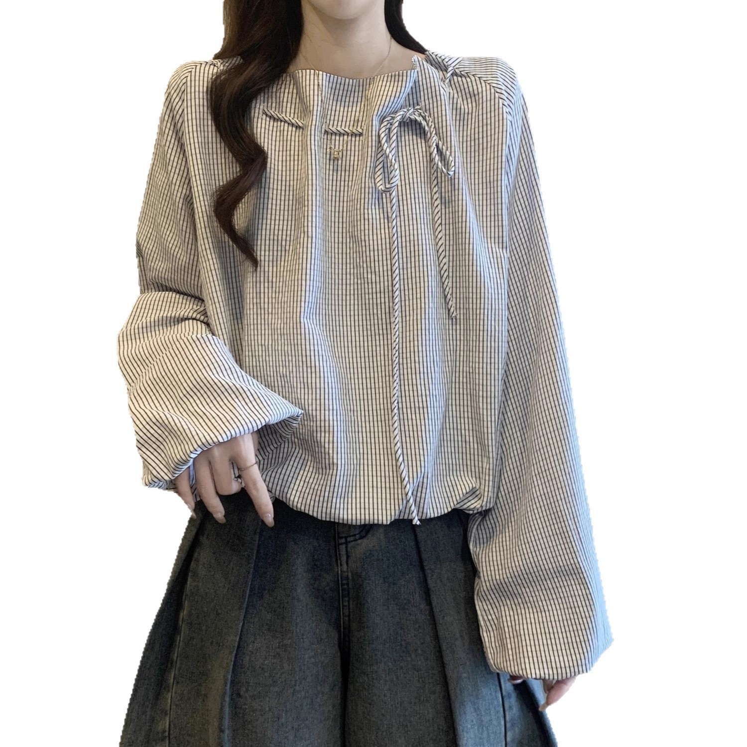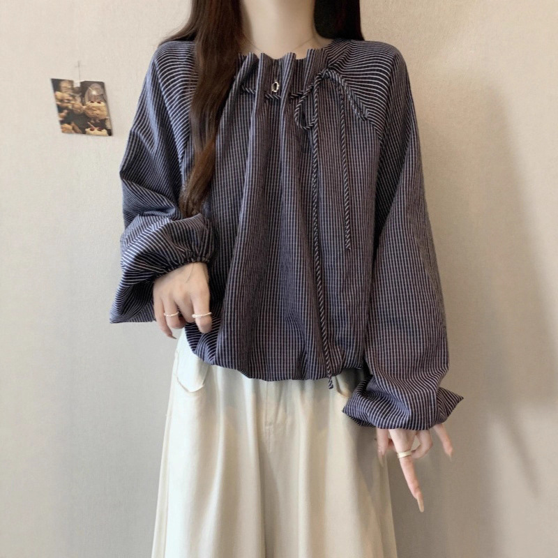 秋装2025新款爆款法式小资系带格子衬衫女设计感灯笼长袖短款