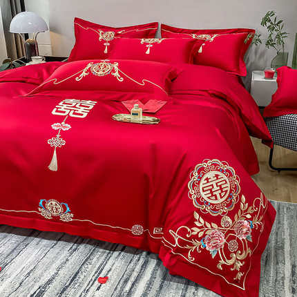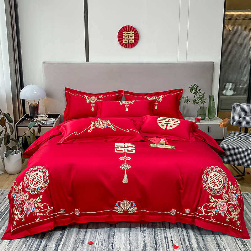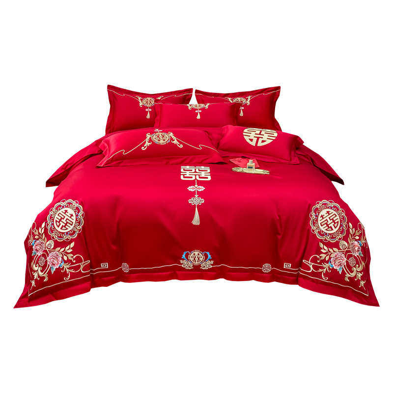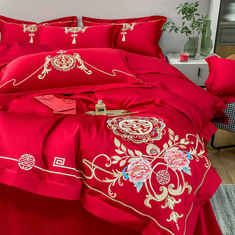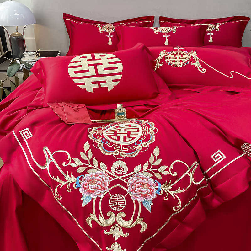 高档婚庆四件套结婚大红色简约刺绣被套床单新婚房喜被床上用品