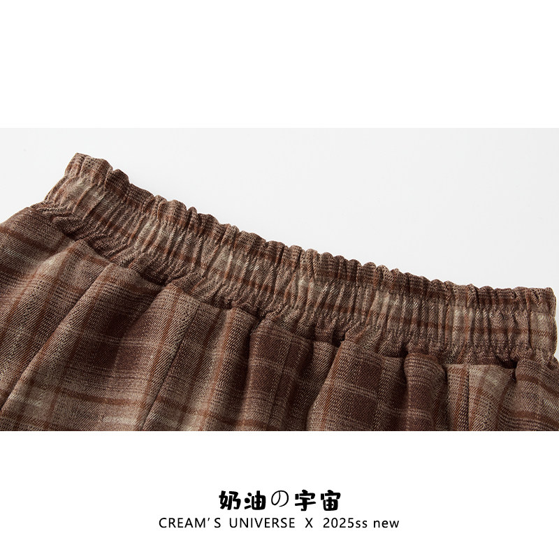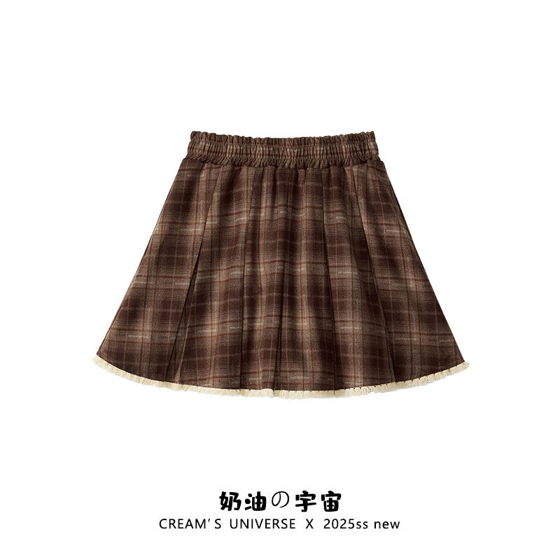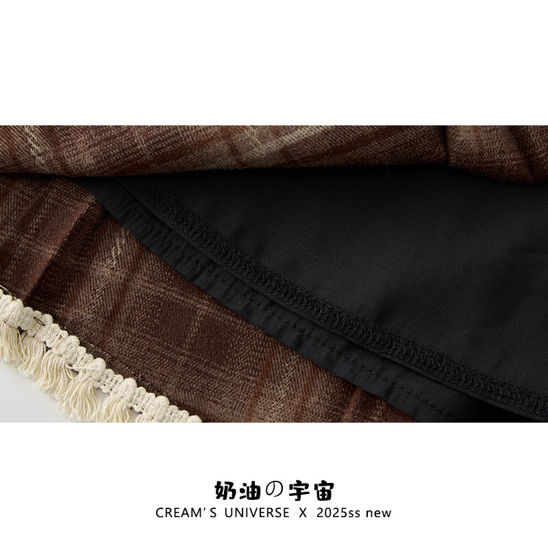 奶油的宇宙 流苏拼接棕色格纹a字短裙女复古美拉德风松紧腰半身裙