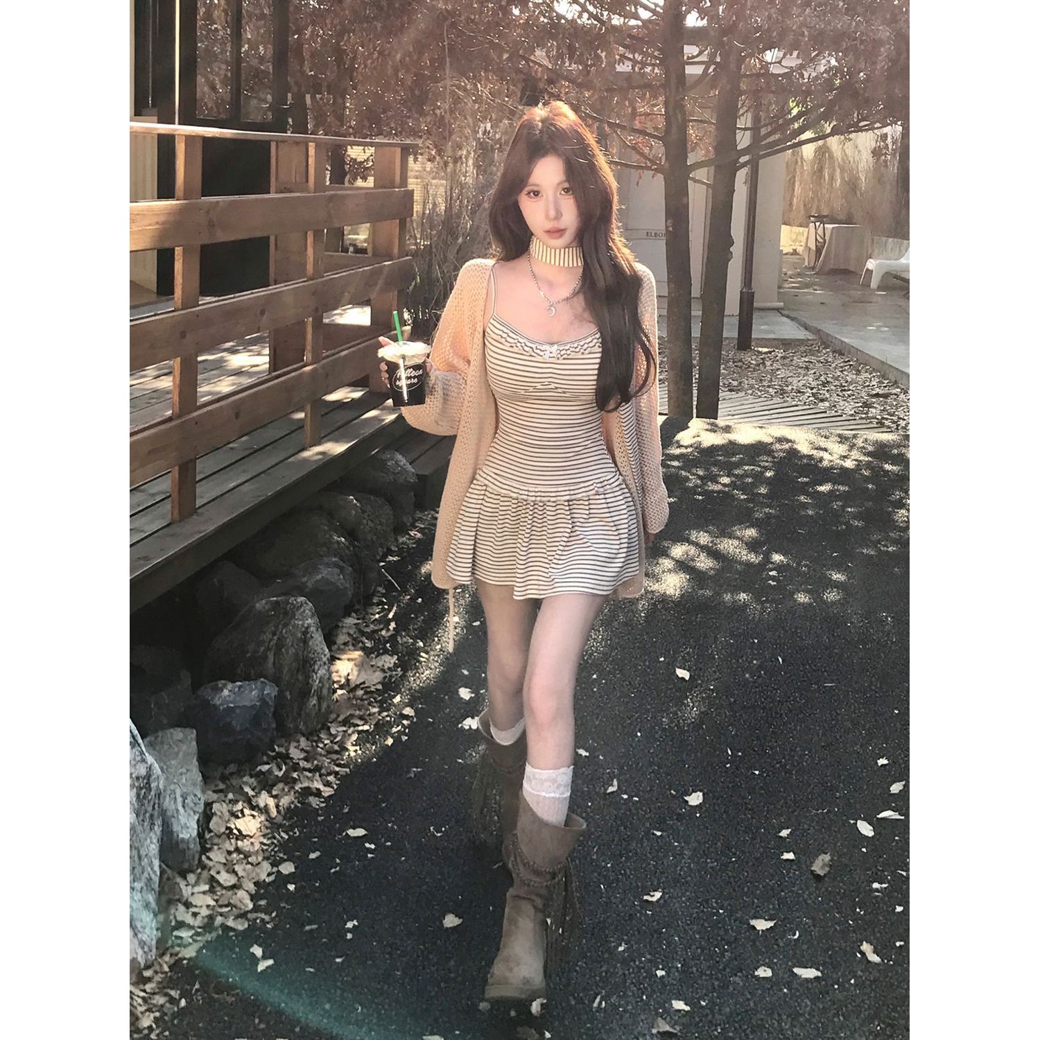 香谢轻语 纯欲性感吊带设计感收腰连衣裙+杏色毛织开衫女秋季新款