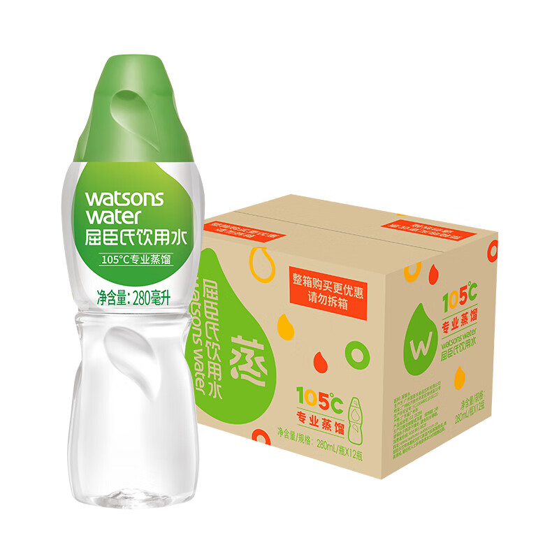 屈臣氏蒸馏制法饮用水280ml*12瓶整箱包邮 屈臣氏水疗敷脸蒸馏水
