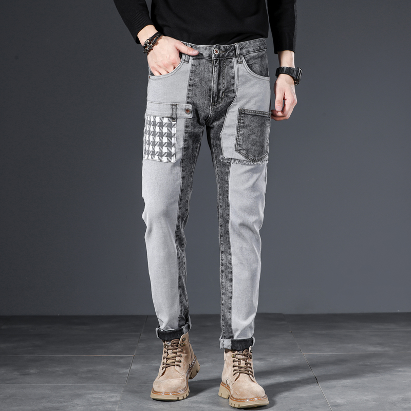 牛仔裤男秋季新款修身小脚韩版潮流个性拼接拼色潮牌男士裤子长裤