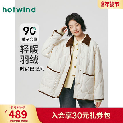 热风女士轻薄羽绒服2025年冬季新款拼色翻领复古巴恩风羽绒服外套