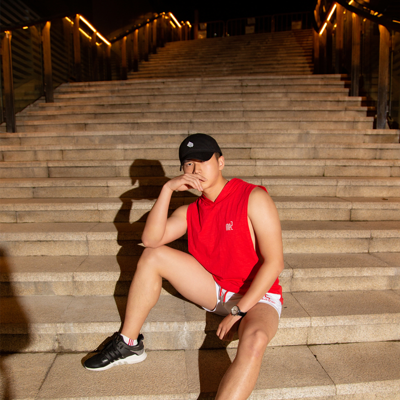 原创潮牌连帽背心男纯棉性感大开叉运动健身健美沙滩T恤男士休闲