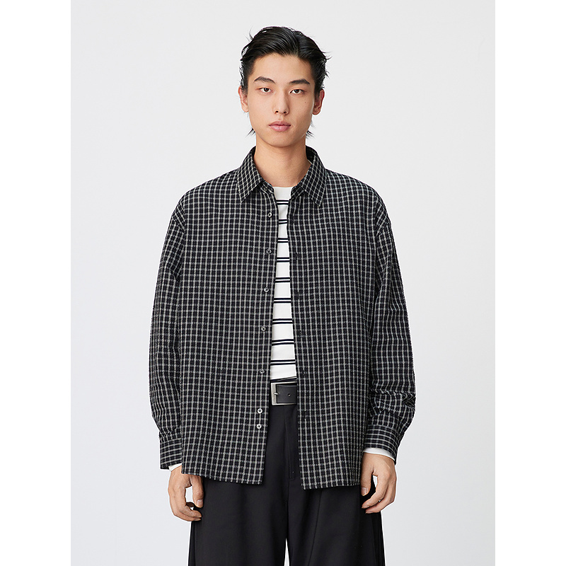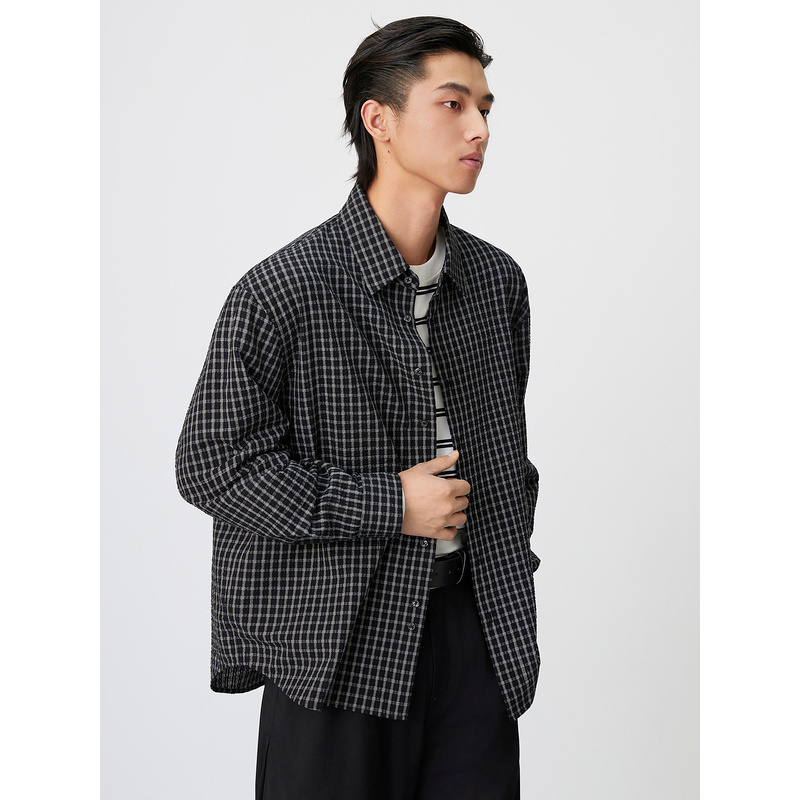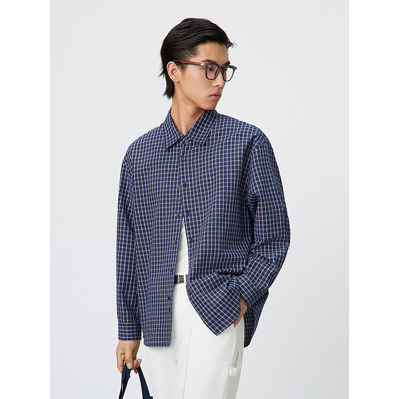 GXG男装 双色撞色格纹休闲时尚宽松翻领长袖衬衫 25年春新品