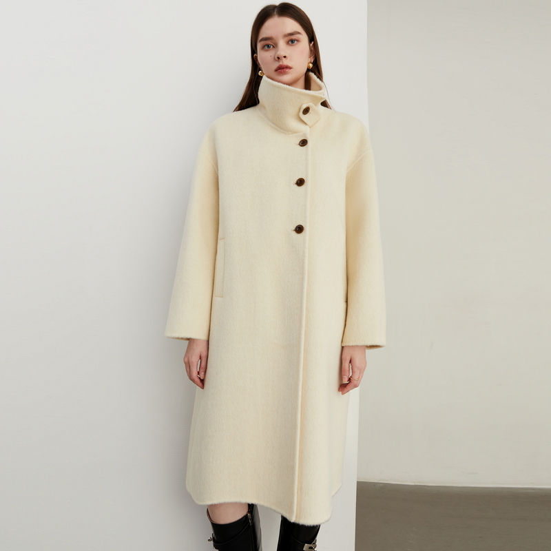 DPLAY冬季新款休闲白色单排扣羊毛大衣长款毛呢外套长袖女