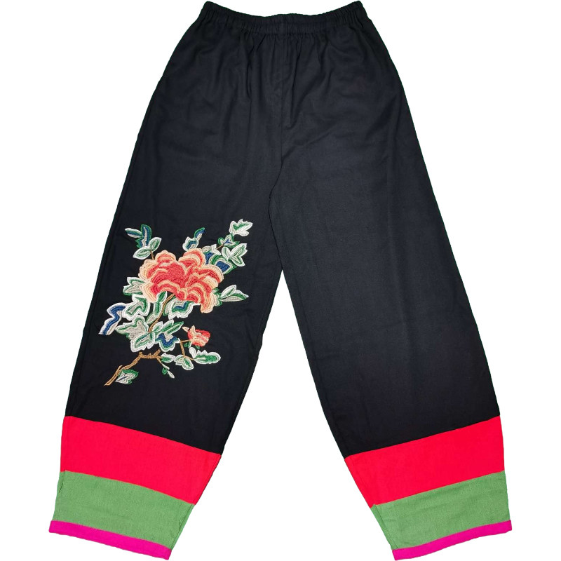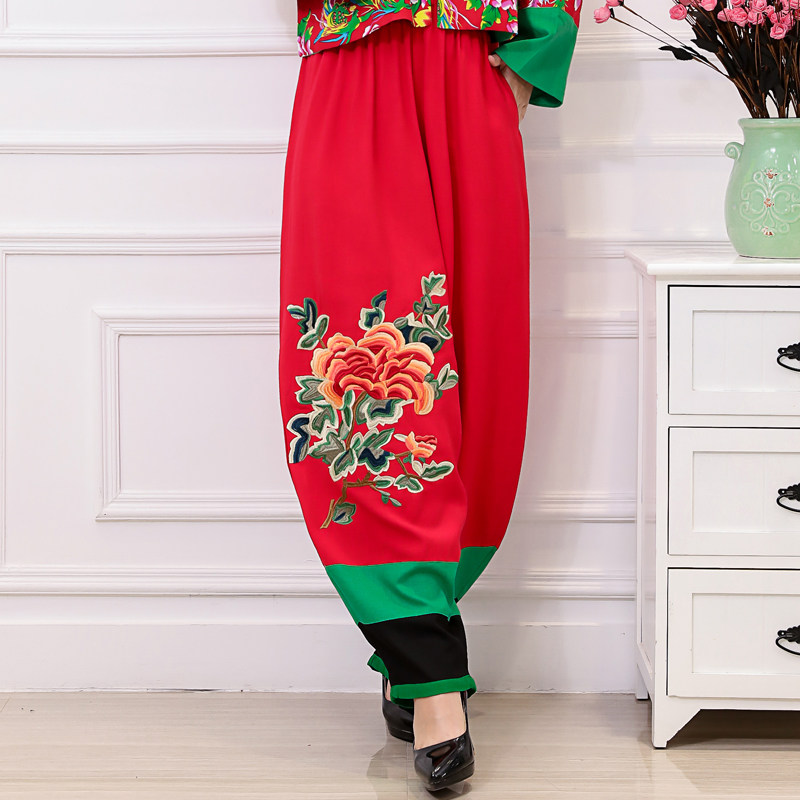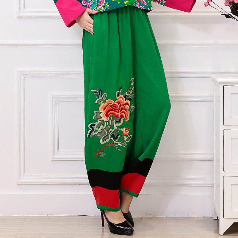 包邮民族风特色复古舞蹈表演长裤 刺绣双口袋棉麻松紧腰 灯笼裤女