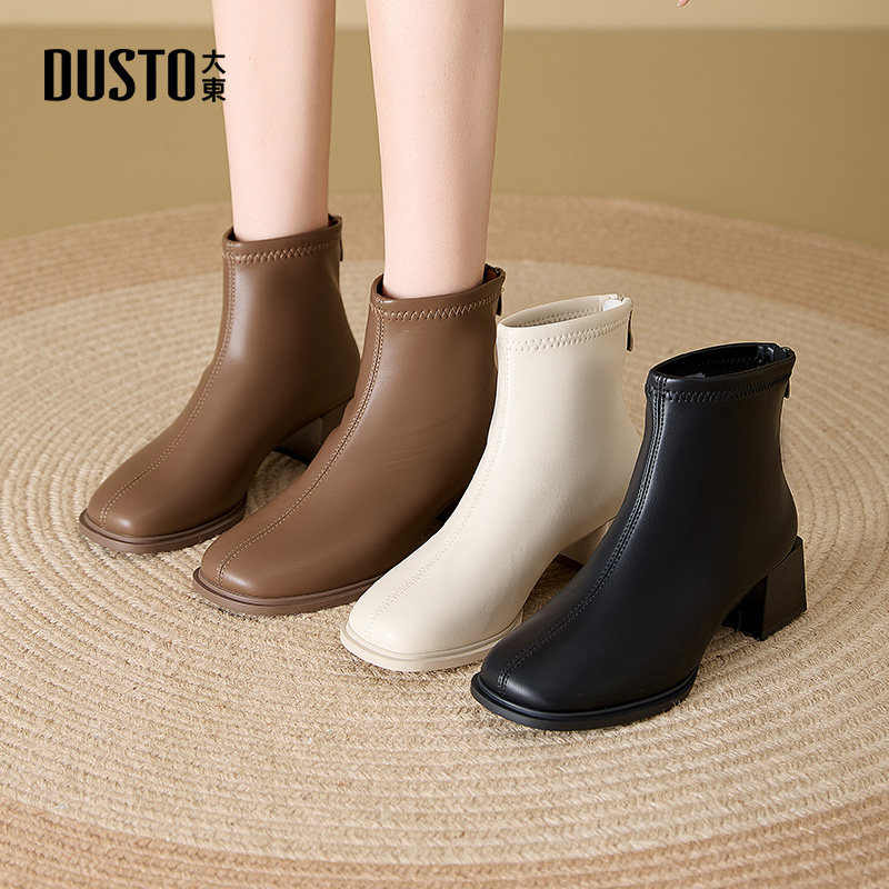 大东女鞋短靴方头粗跟通勤增高