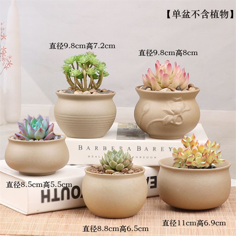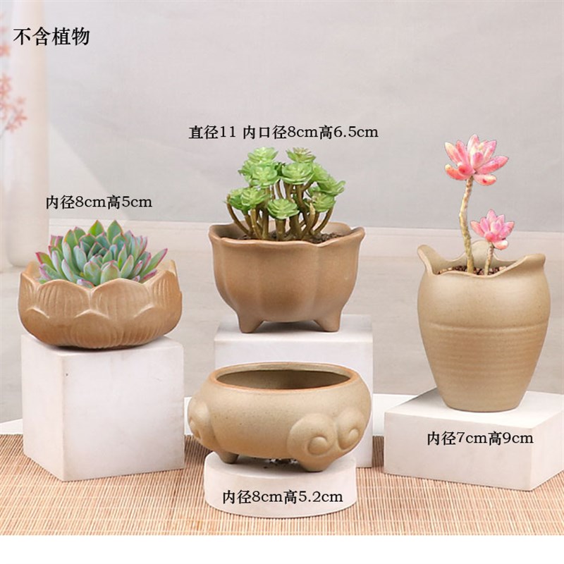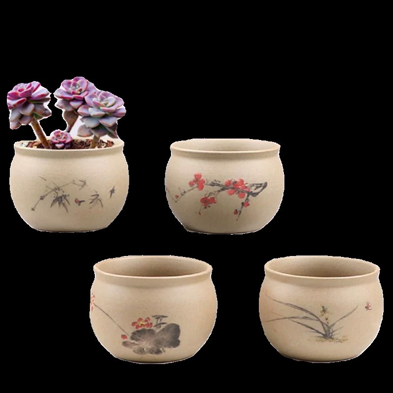粗陶素烧手绘简约梅兰竹荷清新陶瓷花盆创意肉肉植物透气多肉植物