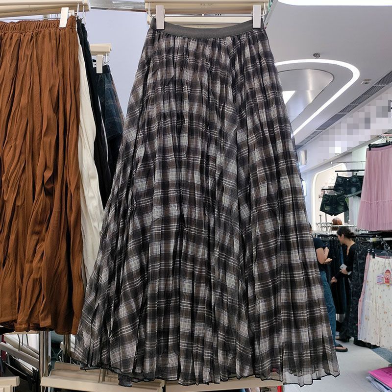 2025秋季新款褶皱复古格子网纱裙大码女中长款高腰大摆A字半身裙