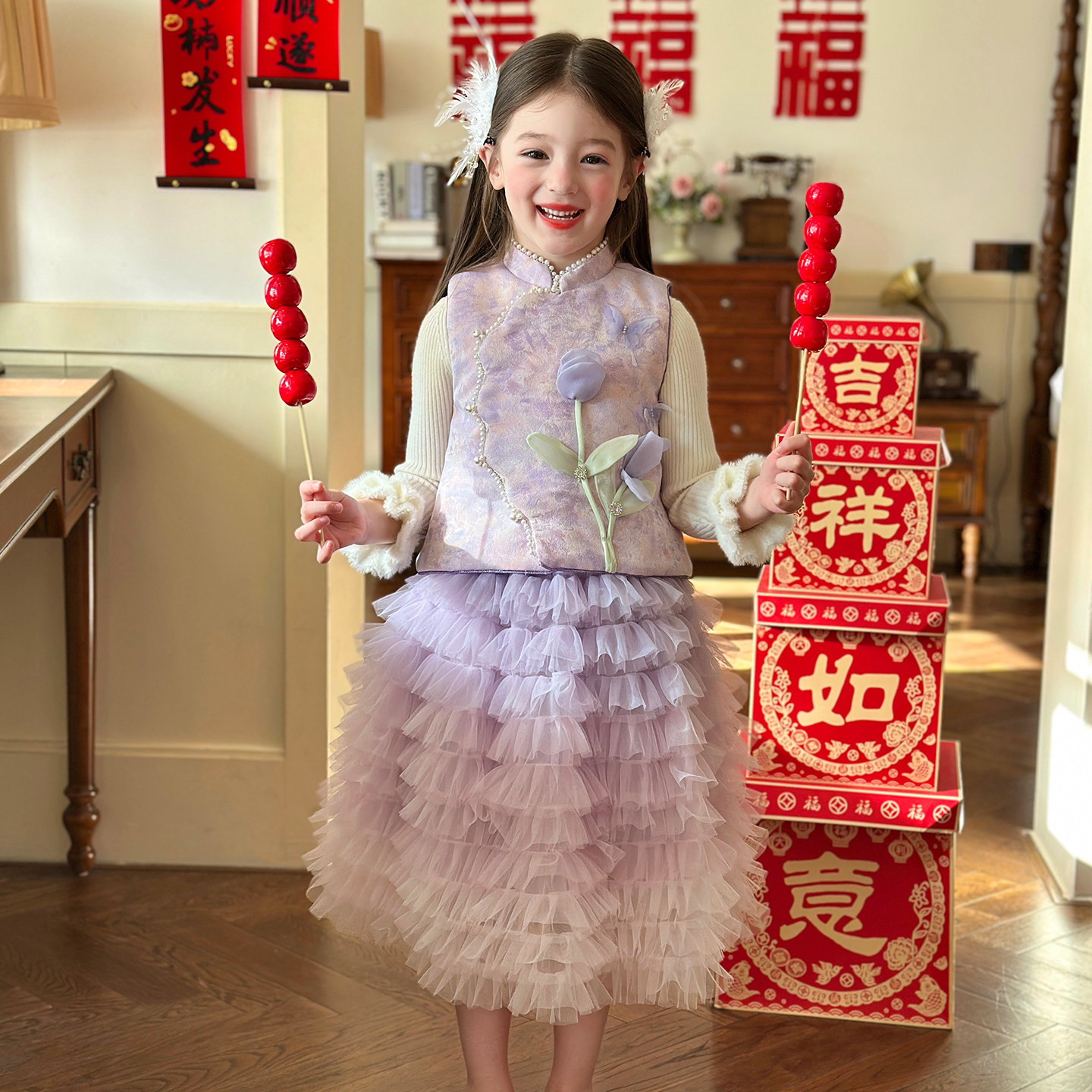 栀了成长记童装女童花朵马甲套装2025冬季儿童新中式国风夹棉上衣