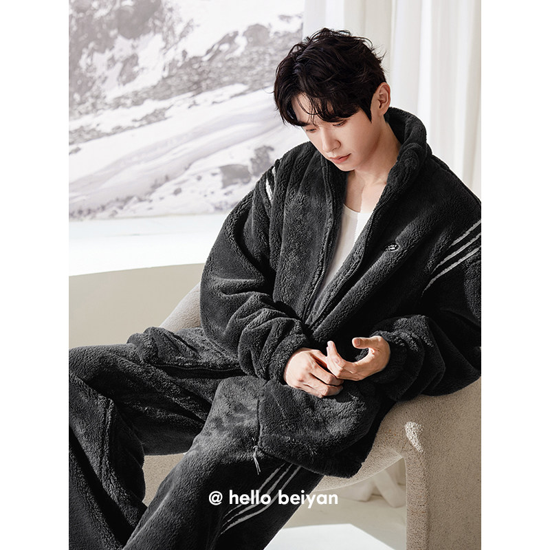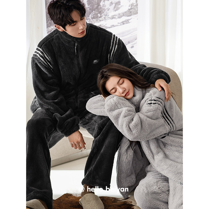 贝妍情侣睡衣女冬珊瑚绒加厚保暖立领开衫运动套装法兰绒家居服男