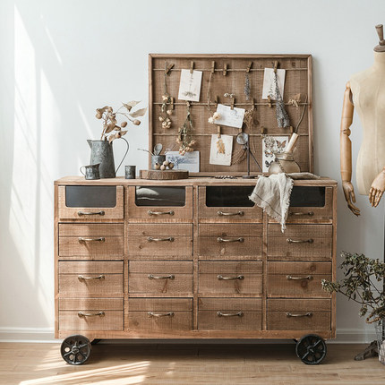 润家家居简约餐边柜做旧实木柜玻璃轮子抽屉柜矮柜储物柜复古美式
