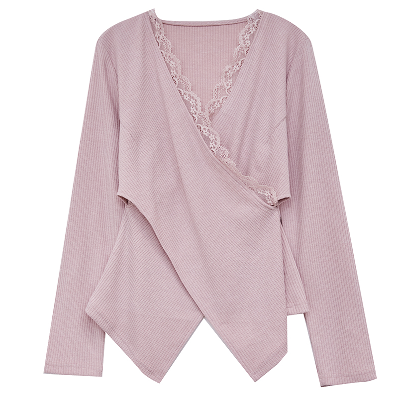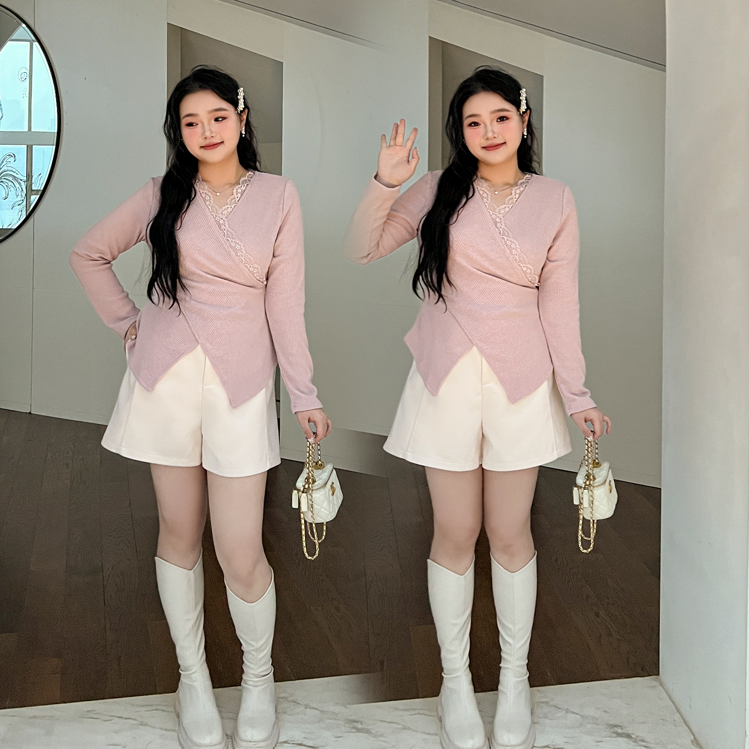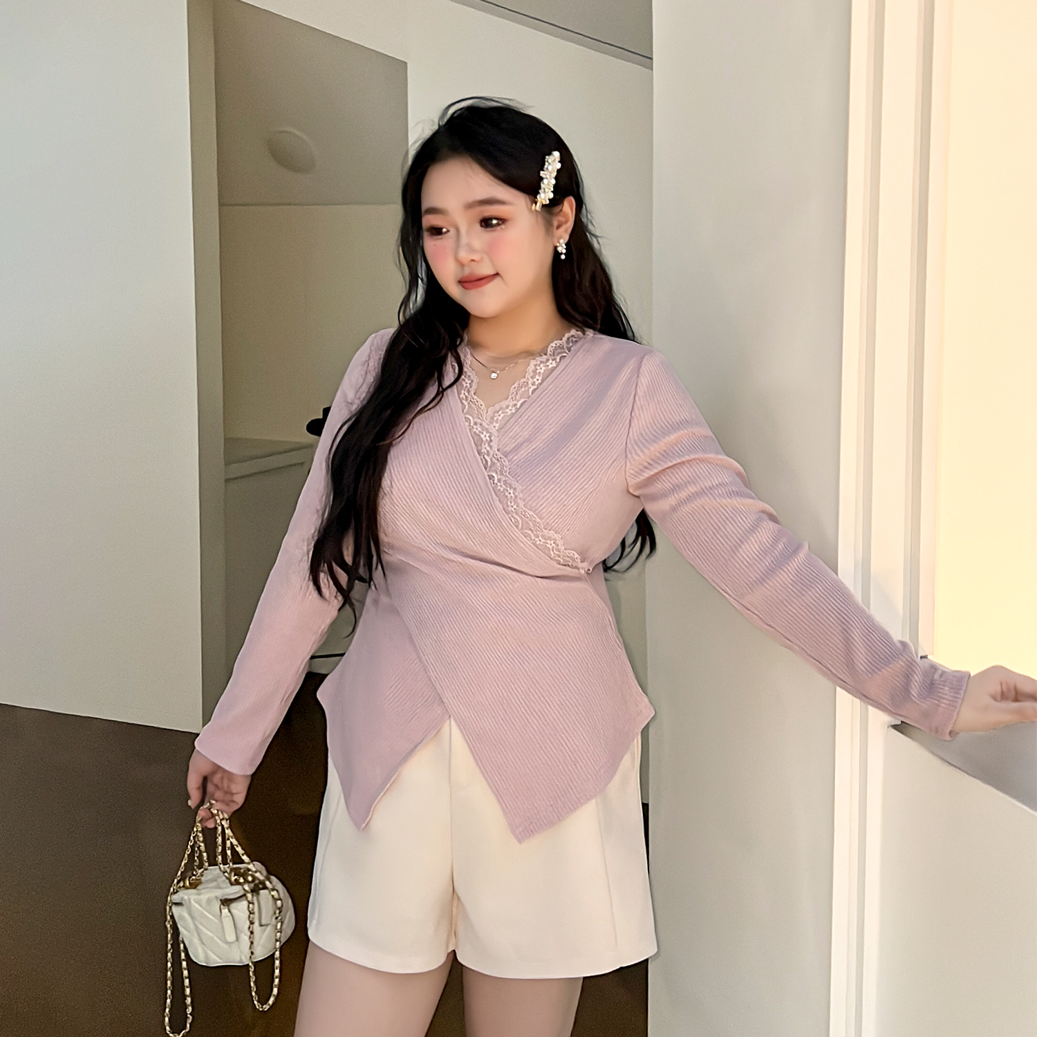 DM100大码百分百微胖mm女装修身上衣法式打底交叉蕾丝拼接针织衫