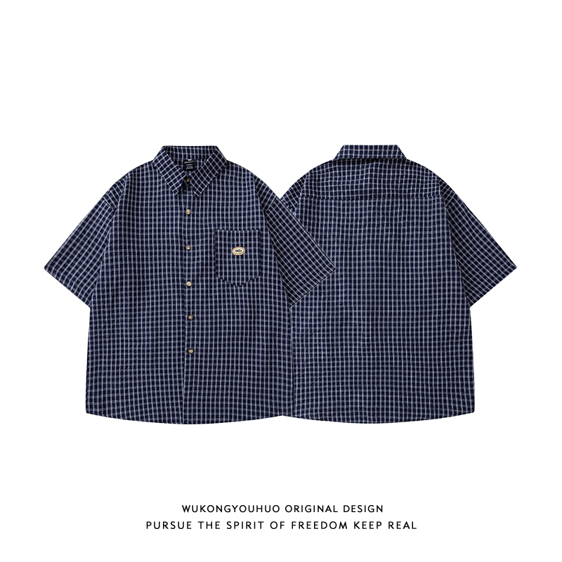 悟空有货日系复古蓝色格子短袖衬衫男夏季慵懒风宽松休闲百搭衬衣