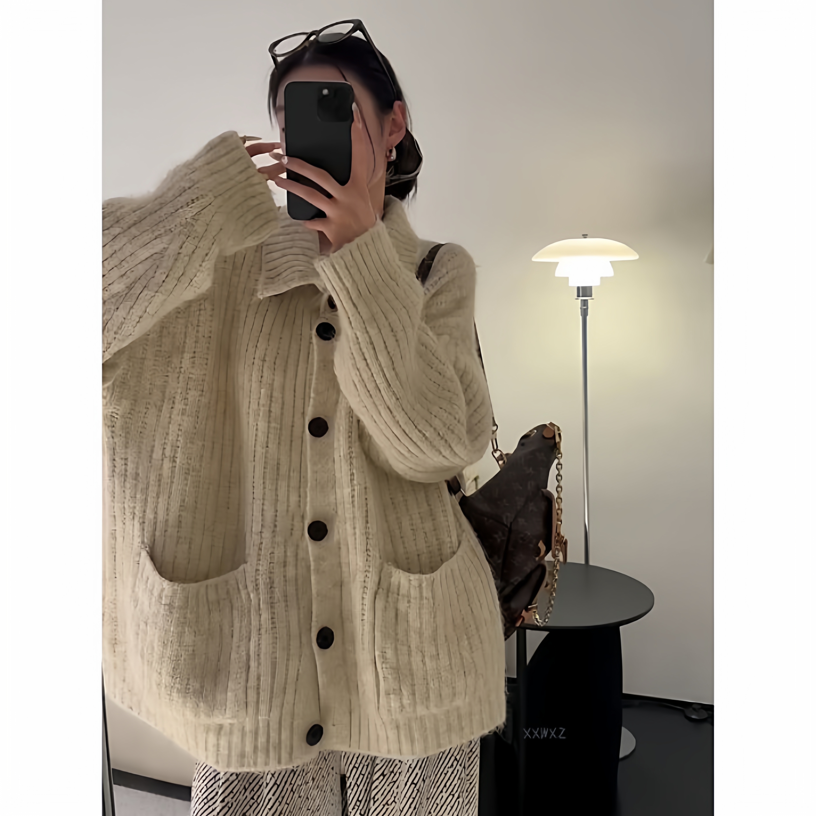 韩系复古高领毛衣开衫外套女秋冬宽松慵懒风高级感厚中长款针织衫