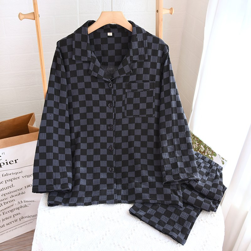 春秋情侣纯棉家居服简约格子男女睡衣大翻领对襟长袖长裤休闲居家