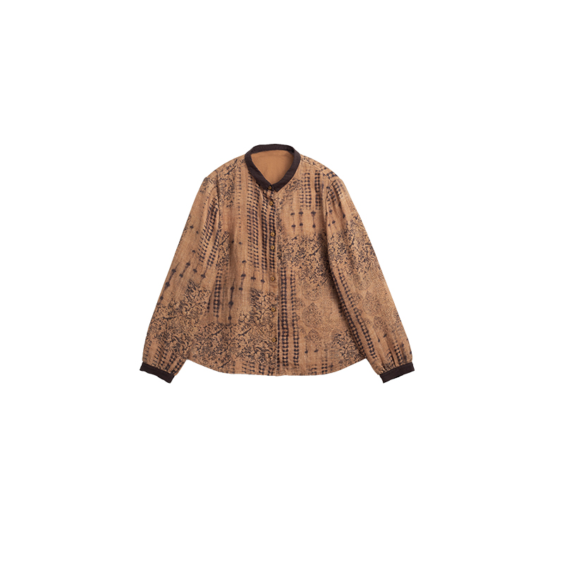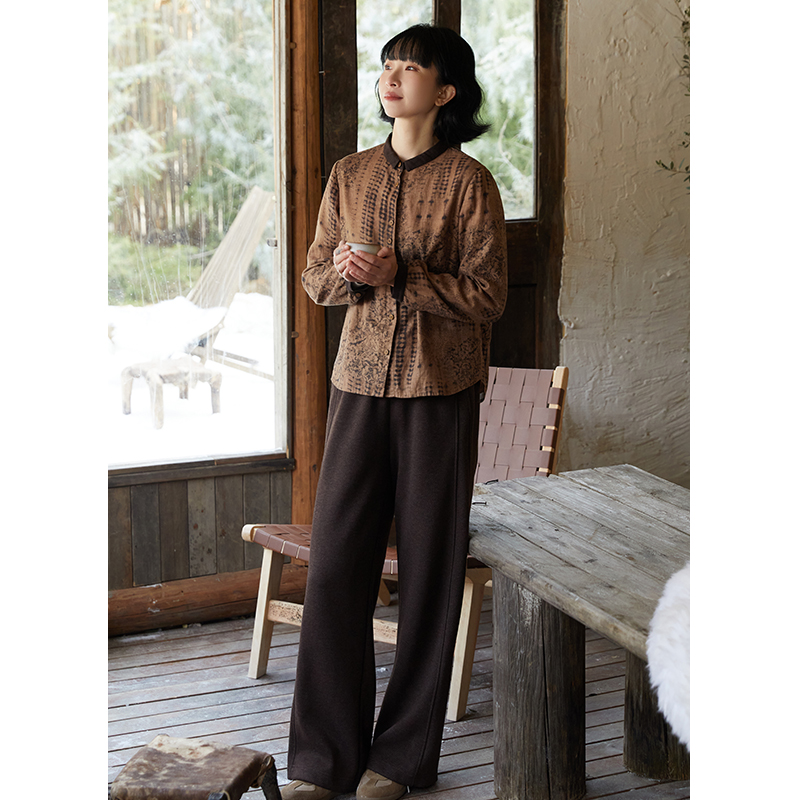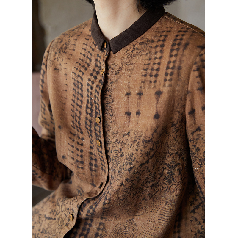 忘城N650座/幸福角落/冬季百搭亚麻棉混纺撞色复古印花文艺衬衫女