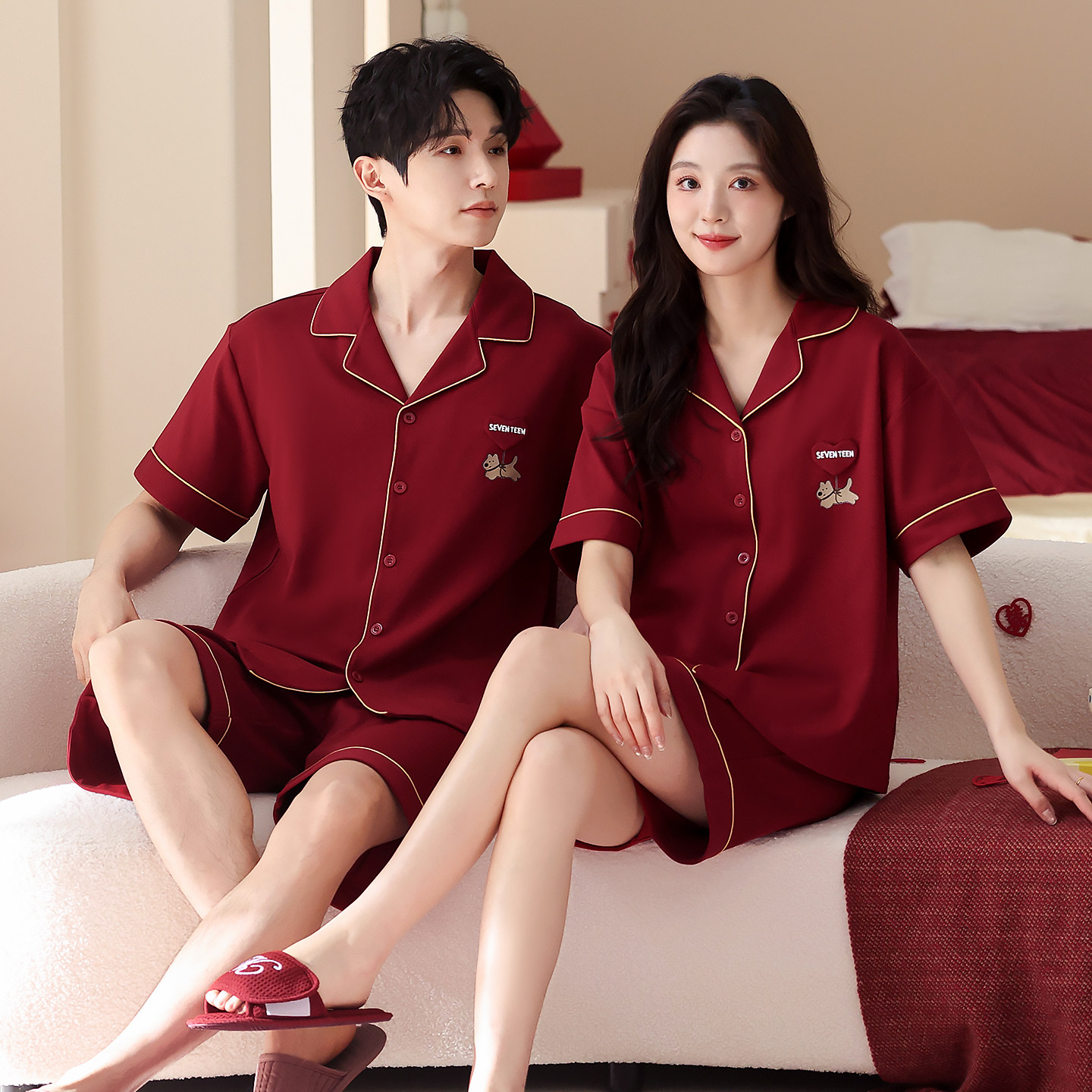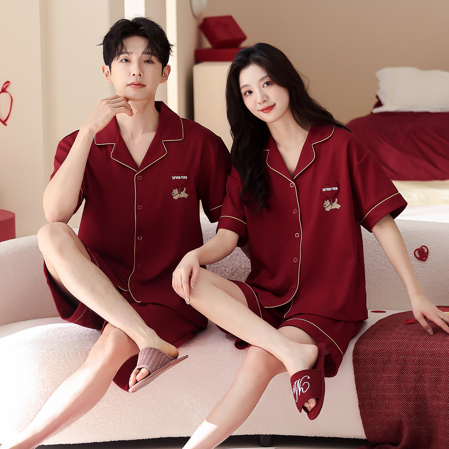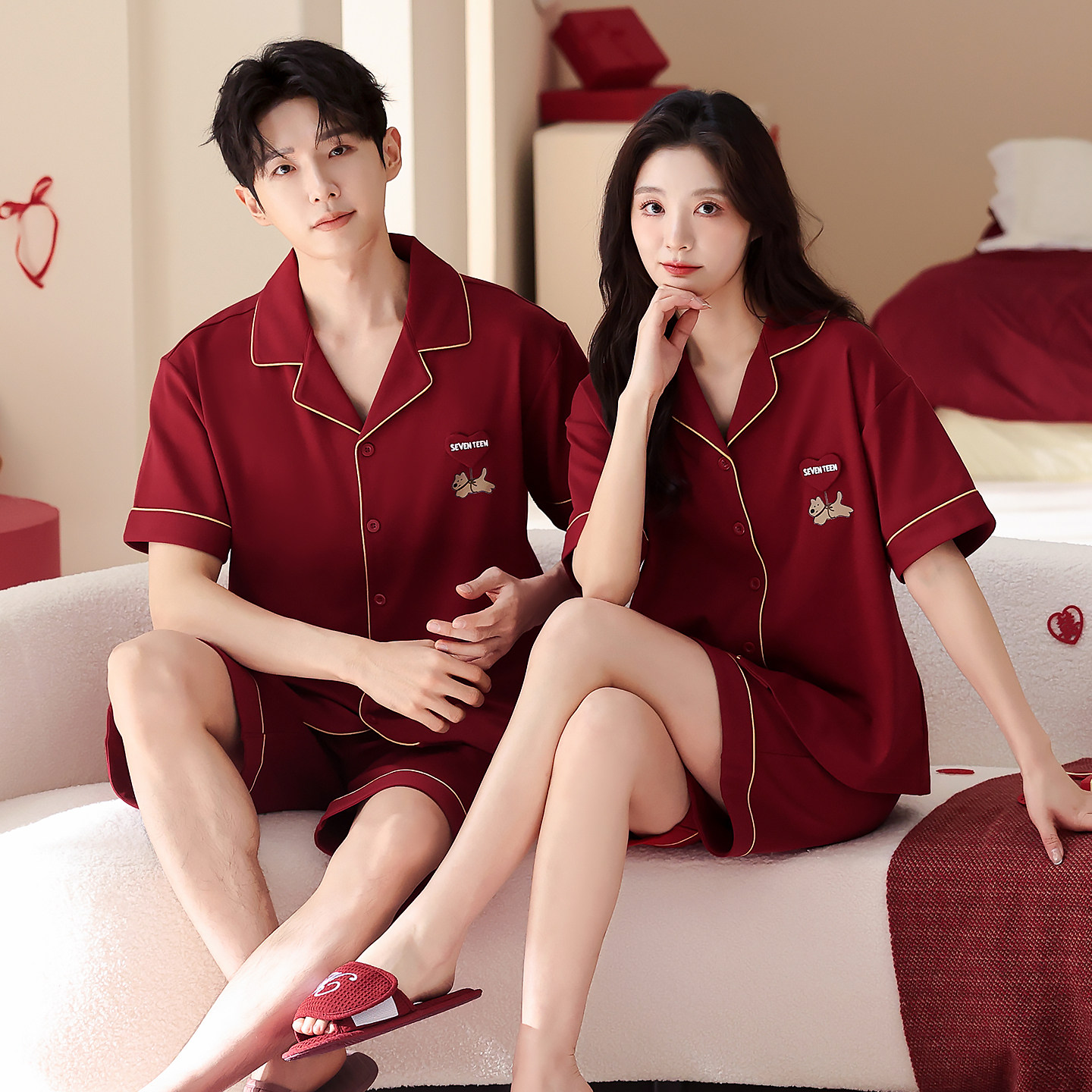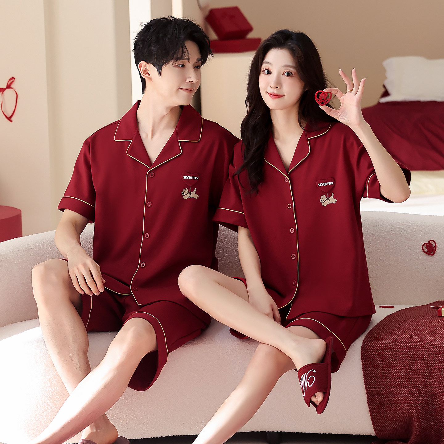 马年情侣红色纯棉睡衣夏季男女短袖短裤本命年结婚家居服翻领套装