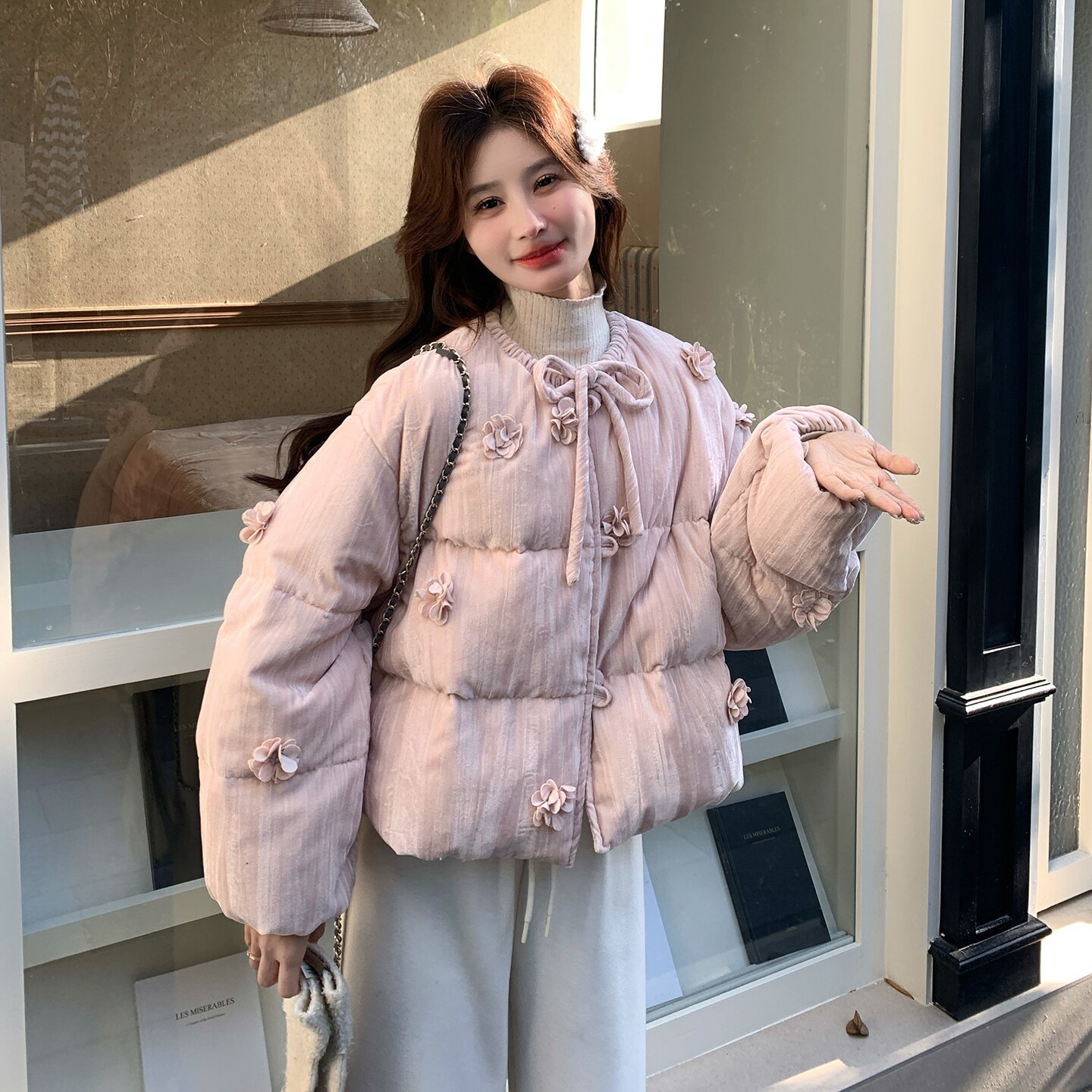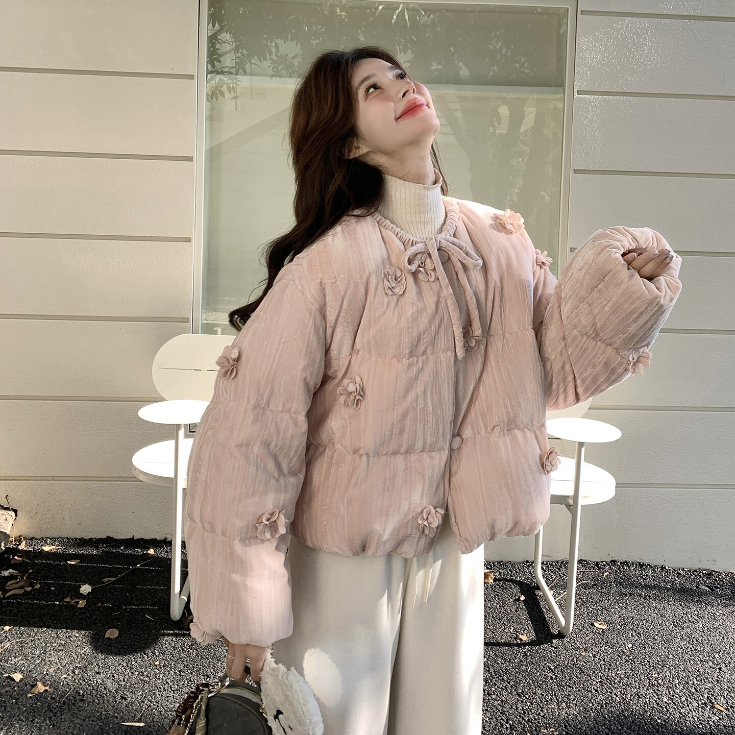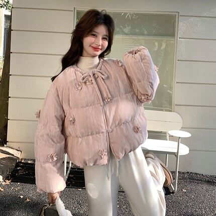粉色可盐可甜立体花朵羽绒服女2025年冬季新款90白鸭绒轻暖面包服