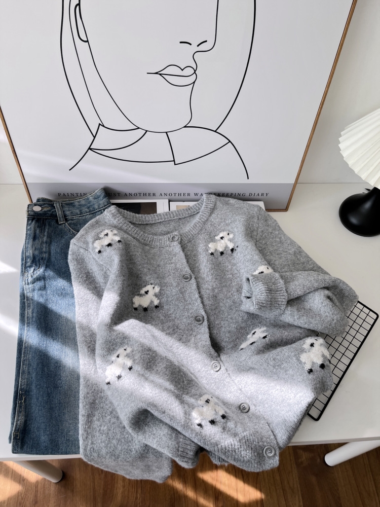 日韩系复古学院风刺绣毛衣针织开衫女春秋冬上衣外套小个子叠穿搭